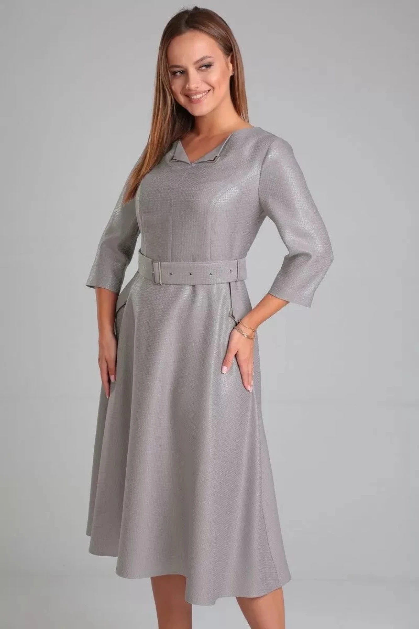 Платье полуприлегающего силуэта, отрезное по линии талии. Горловина с фигурным вырезом, обработана обтачкой. По переду лифа - рельефные швы. По спинке лифа талиевые вытачки и средний шов, в котором обработана потайная молния. Юбка платья ""клеш"". Рукав втачной прямой, длиной 3/4. В комплекте к платью прилагается съемный пояс.