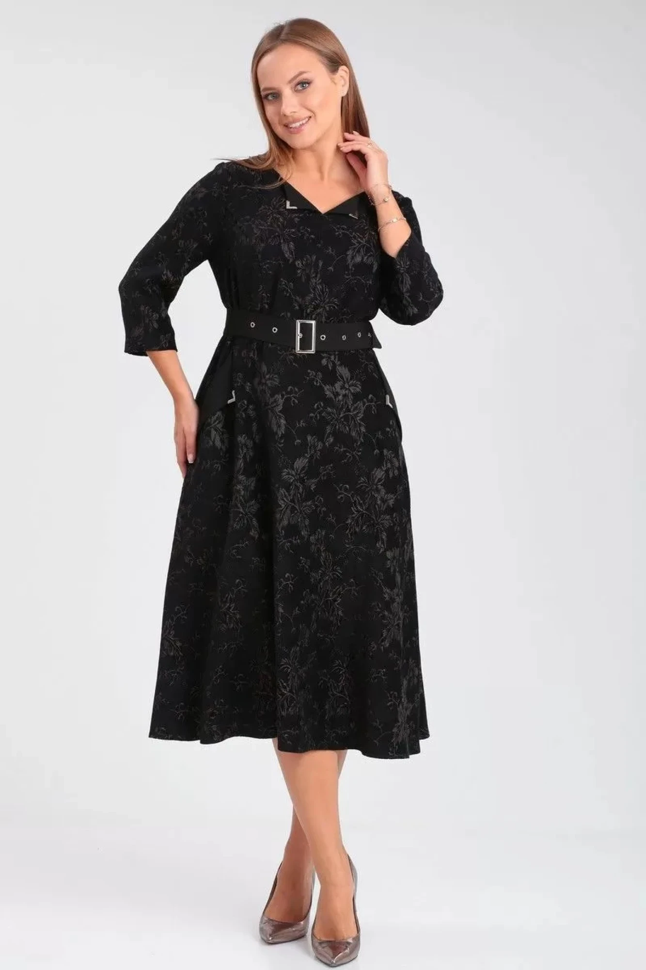 52,54, 56 ,58Платье полуприлегающего силуэта, отрезное по линии талии. Горловина с фигурным вырезом, обработана обтачкой. По переду лифа - рельефные швы. По спинке лифа талиевые вытачки и средний шов, в котором обработана потайная молния. Юбка платья ""клеш"". Рукав втачной прямой, длиной 3/4. В комплекте к платью прилагается съемный пояс."