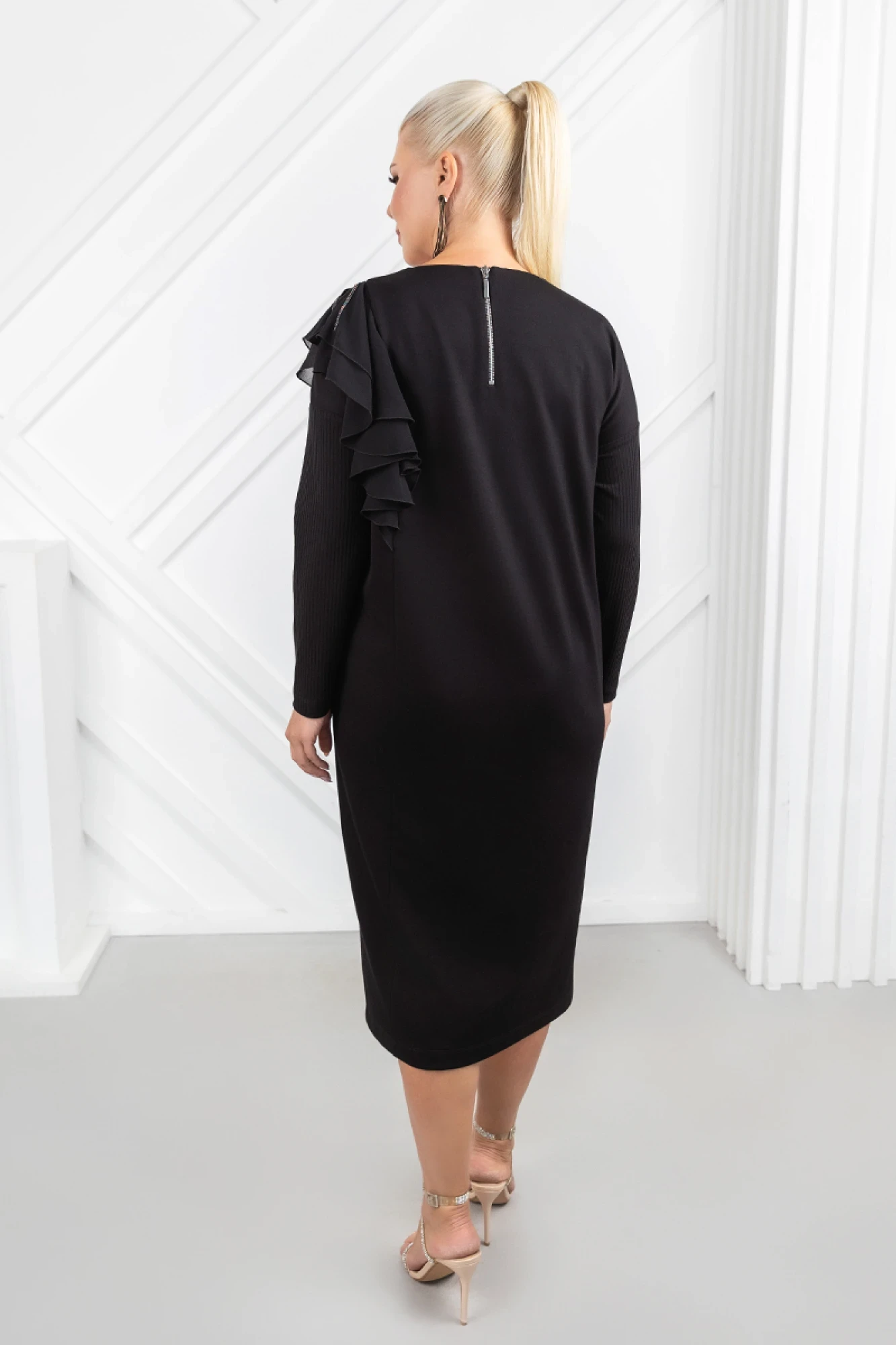 По переду и спинке вертикальный рельеф с декоративными воланами из шифона и металлической бахромой. Карманы в боковых швах. По спинке застежка на тесьму молнию с металлическим звеном.