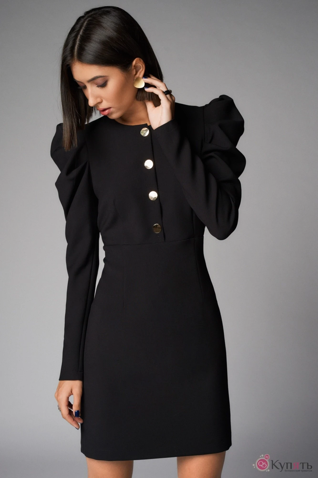 Платье женское из плательной ткани прилегающего силуэта, отрезное выше линии талии. Горлоивна на обтачке. Застежка центральная - петли пуговицы. По спинке средний шов с потайной тесьмой молнией и таллиевыми вытачками. Рукав одношовный со сборкой по окату.