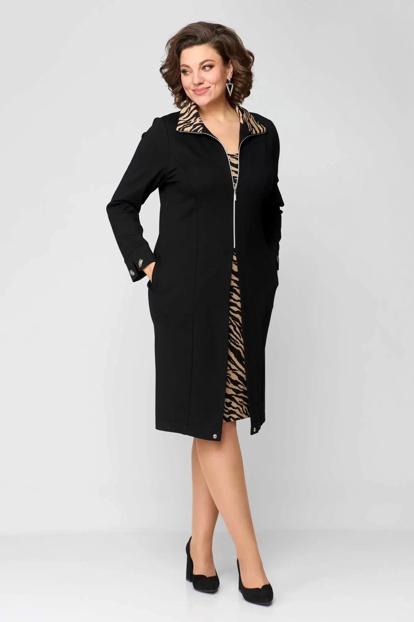 50, 52 , 54 , 56 , 58Выполнено из плотного однотонного трикотажного полотна и мягкого , принтованного, приятного на ощупь трикотажа в виде отделочных деталей и элементов. Платье с разъемной затежкой - молния по переду визуально имитирует кардеган одетый на платье .Платье полуприлегающего силуэта длиной «миди». Горловина округлая с втачным воротником-стойкой, застегивающимся на молнию. Рукав втачной с притачной декоративной манжетой. Для свободы движения по спинке выполнена разрез-шлица. Элементами декора выступают искрящие пришивные стразы на модели.