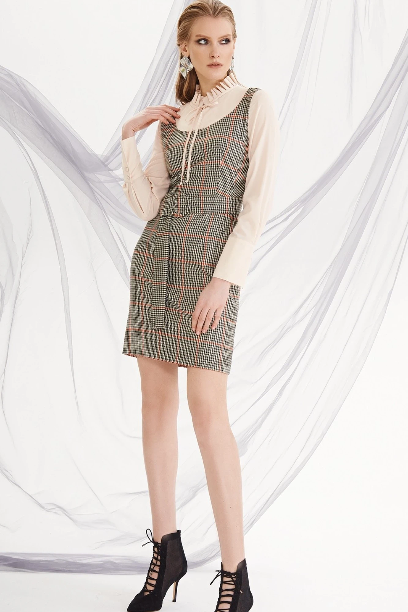 Платье комбинированное из блузочной и плательной ткани прилегающего силуэта, расширенное к низу, отрезное по линии талии спереди; кокетка и рукава выполнены из блузочной ткани; рукав втачной, длинный, с широкой манжетой по низу; по горловине - рюшь; завязка-пояс съемный на пряжке