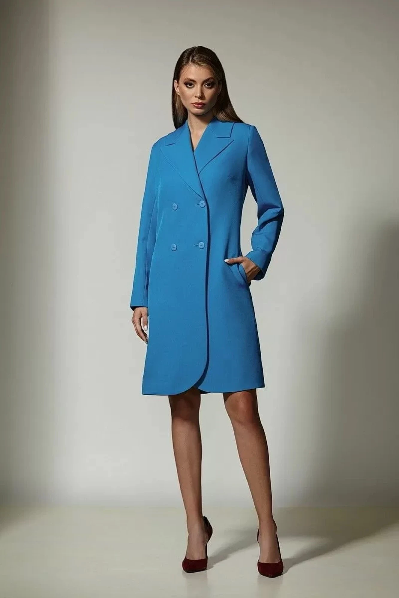 Двубортное платье из костюмной ткани на подкладке. Силуэт платья-слегка приталенный.По переду - нагрудные вытачки, по спинке -рельефы. Бочки, смещенные к переду, делают удобным расположение карманов в швах. Воротник - отложными лацканами пиджачного типа. Рукава - двухшовные, длинные, со шлицей и 2 пуговицами. Жакет застегивается на 2 основные пуговицы, 1 потайную, остальные пуговицы несут декоративный характер. Цвет