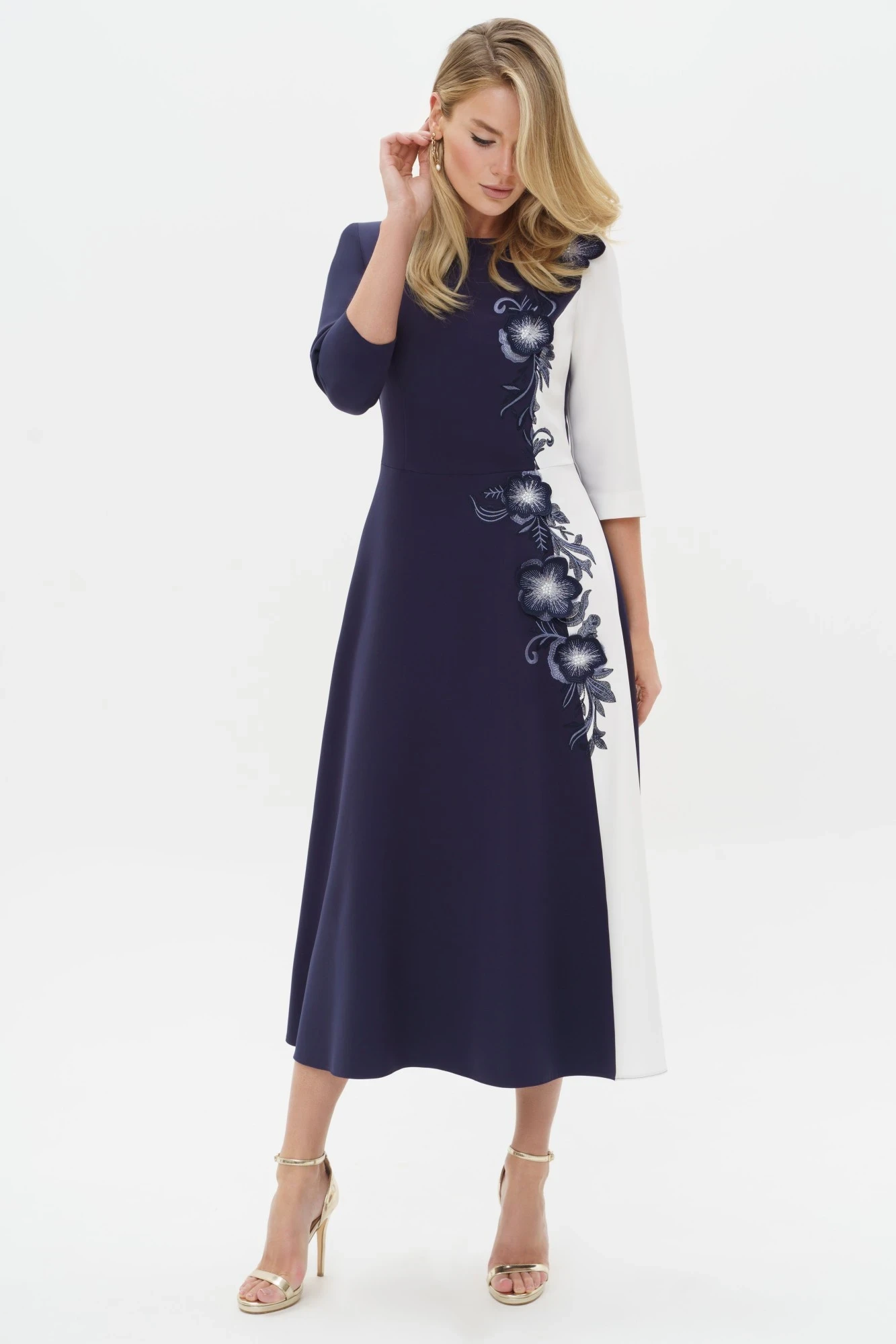 Платье женское полуприлегающего силуэта на подкладке, отрезное по линии талии, двухцветное. Платье нарядное.