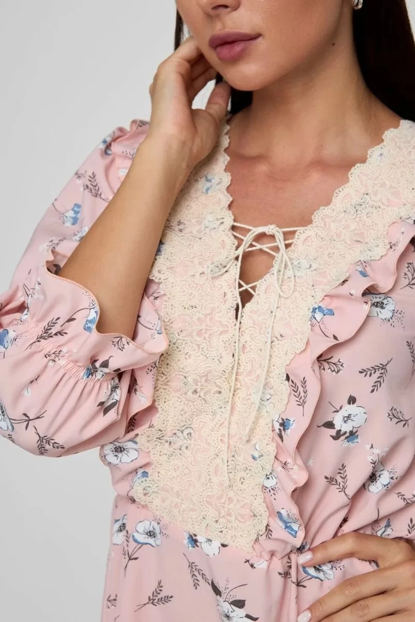 На передней части платья акцентирована центральная часть за счёт рюшей и кружева, дополняет их шнуровка по груди.