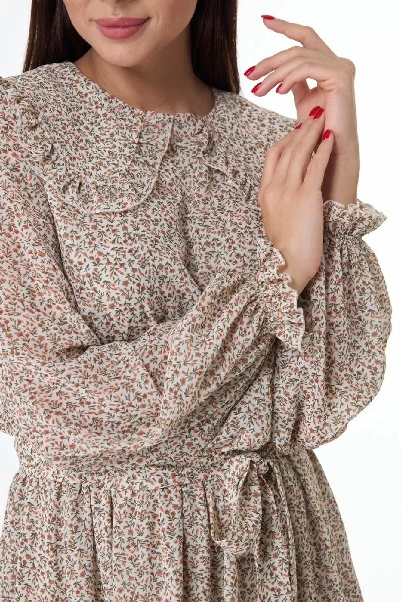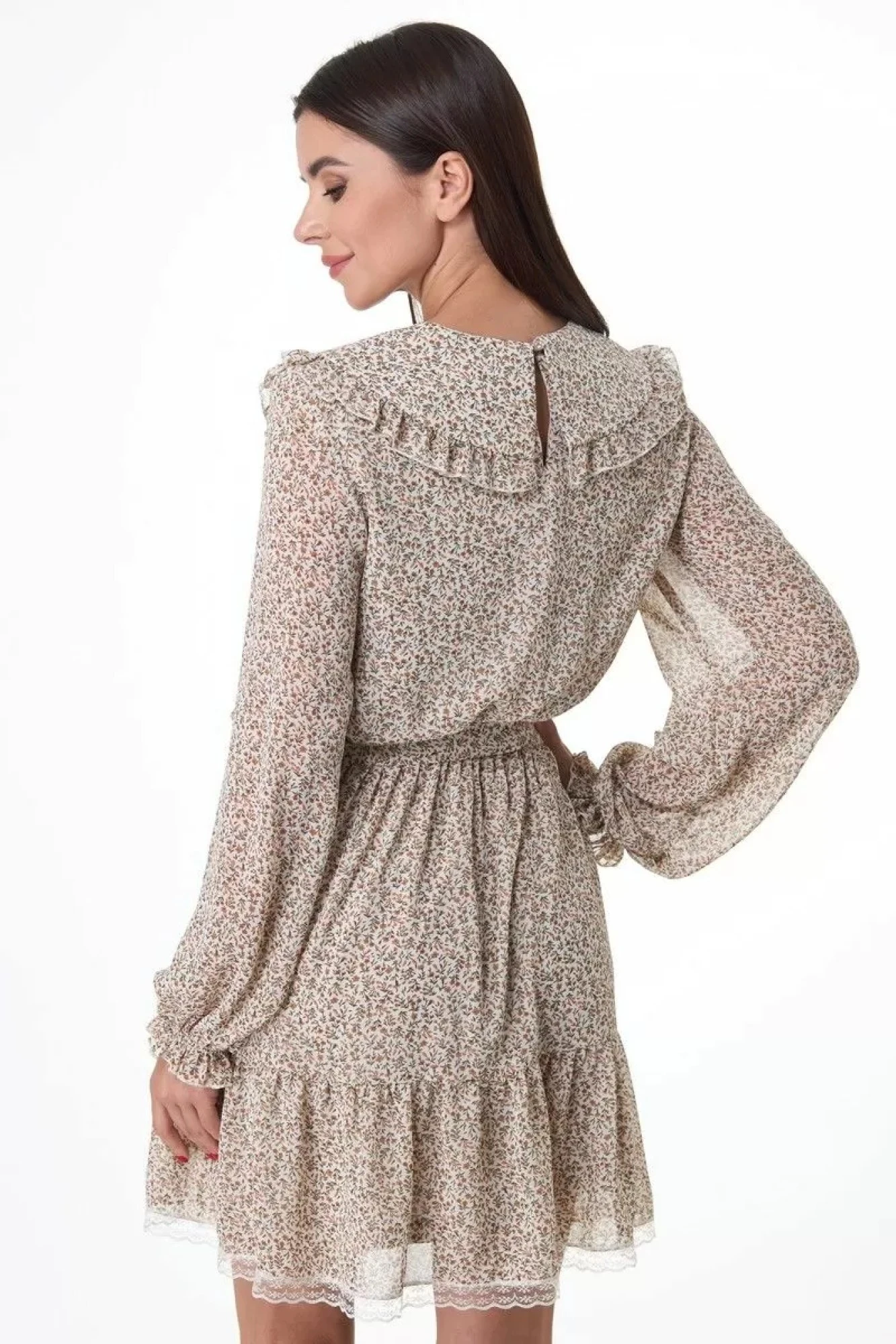 Отрезное по линии талии,втачной свободный рукав на резинке по низу.Расширенный низ платья с притачным воланом и кружевной отделкой.Застежка на навесную петлю и пуговицу по спинке вверху.