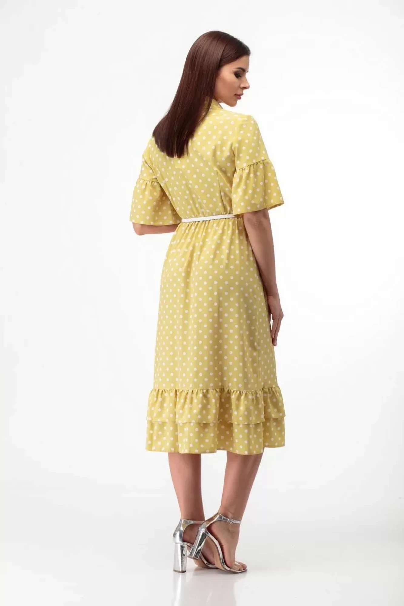 Полуприлегающий силуэт, отрезное по линии талии, нагрудные вытачки втачные рукава с воланом. Отложной воротник на стойке. Функциональная застежка по планке на пуговицы по всей длине. Воланы по низу платья.