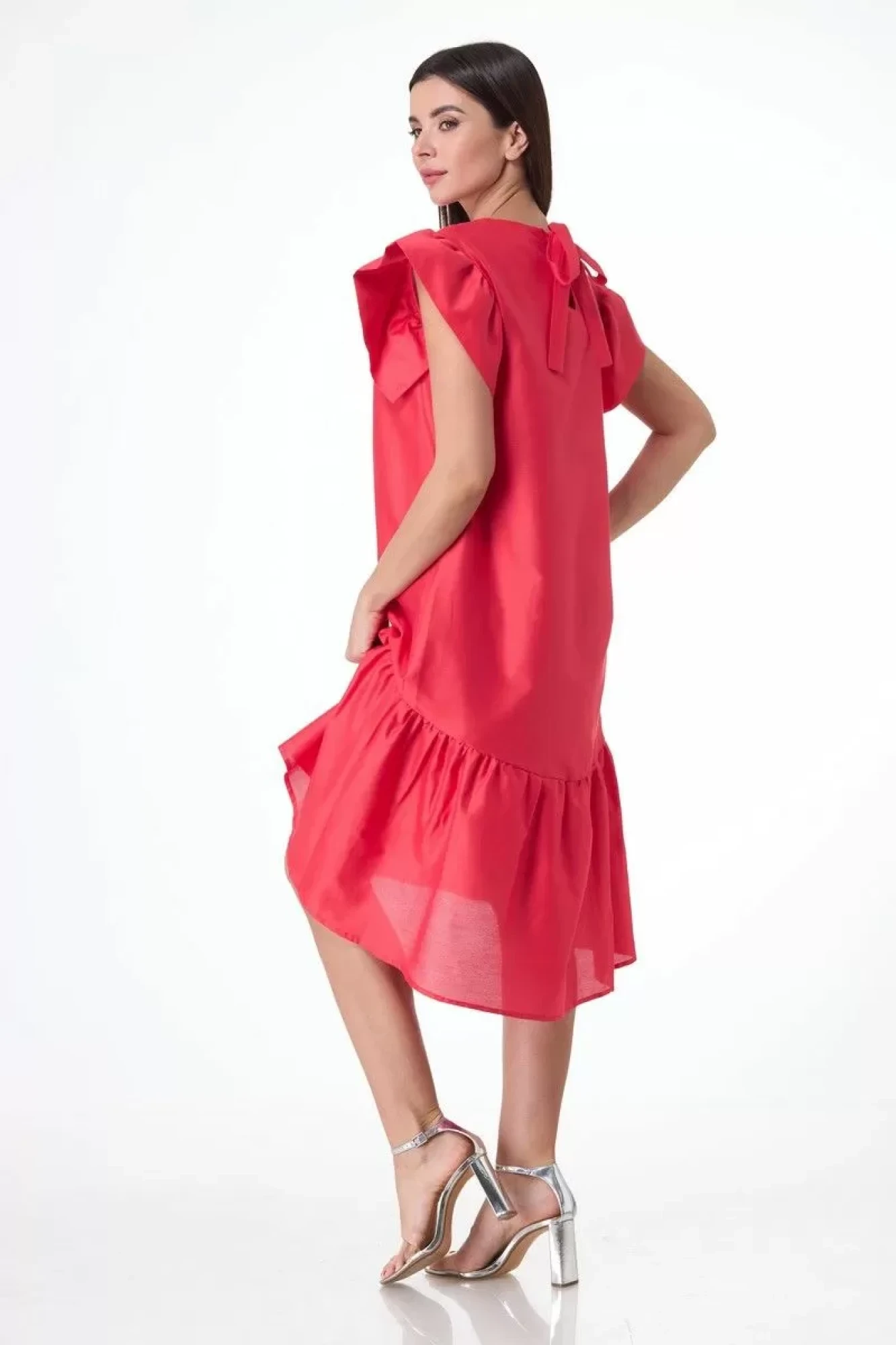 Рукава-воланы, застежка на завязывающиеся детали по спинке вверху. По низу платья притачной широкий волан.