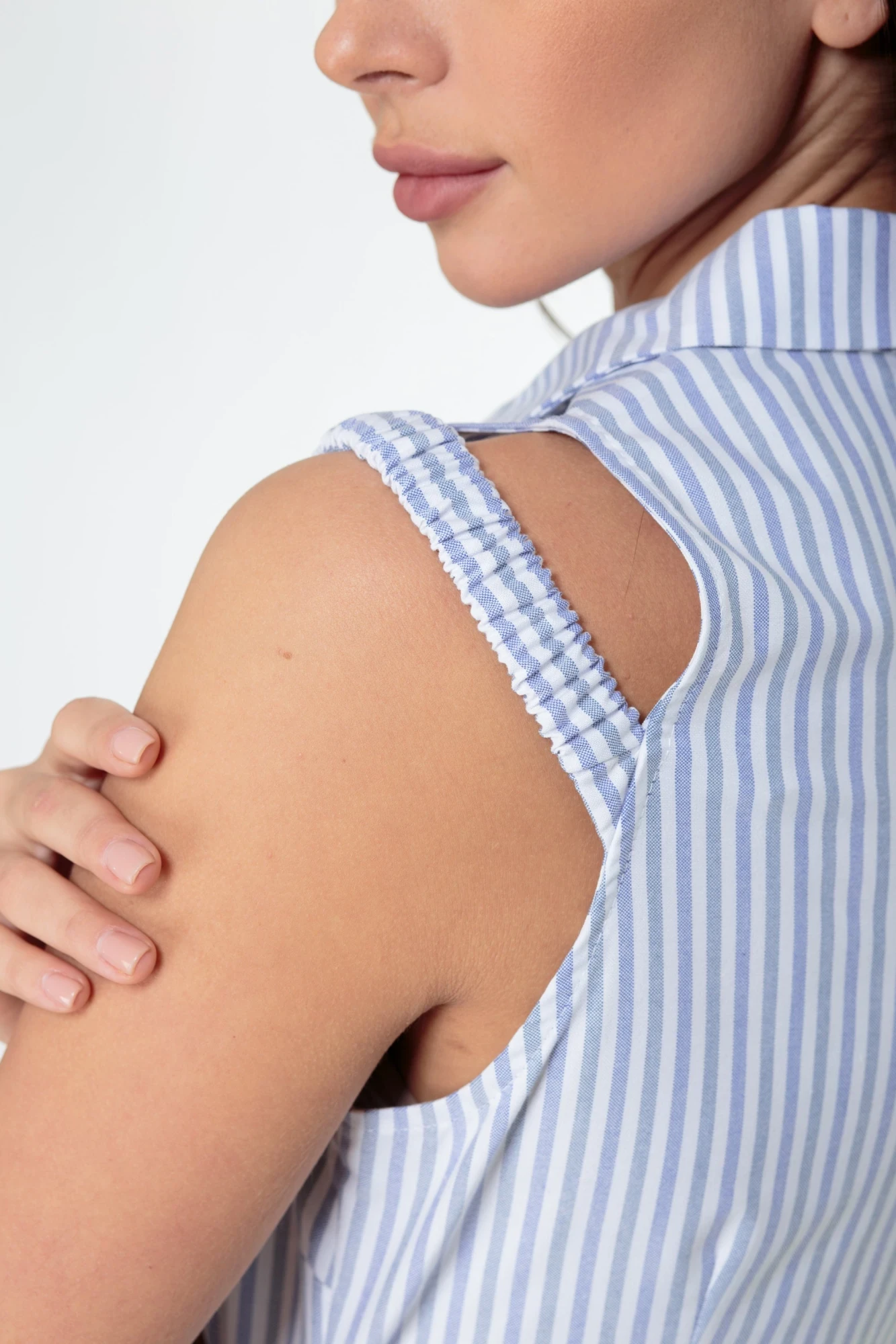 46,48,50Полуприлегающий силуэт, рубашечный воротник, застежка на пуговицы по всей длине. Особенным платье делают скошенная линия плеча с бретелью, собранная резинкой внутри и широкий присборенный по боковым швам завязывающийся пояс.