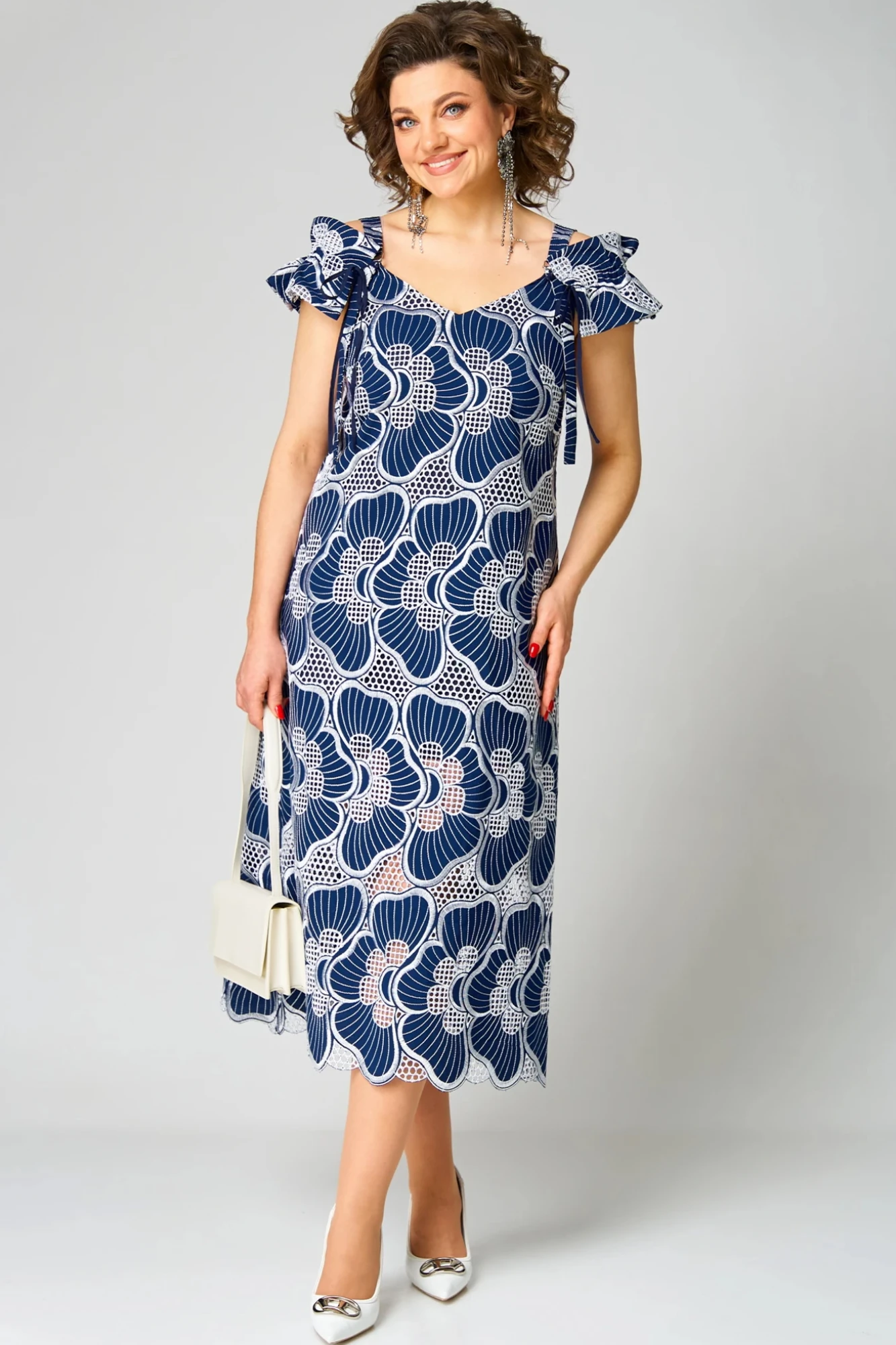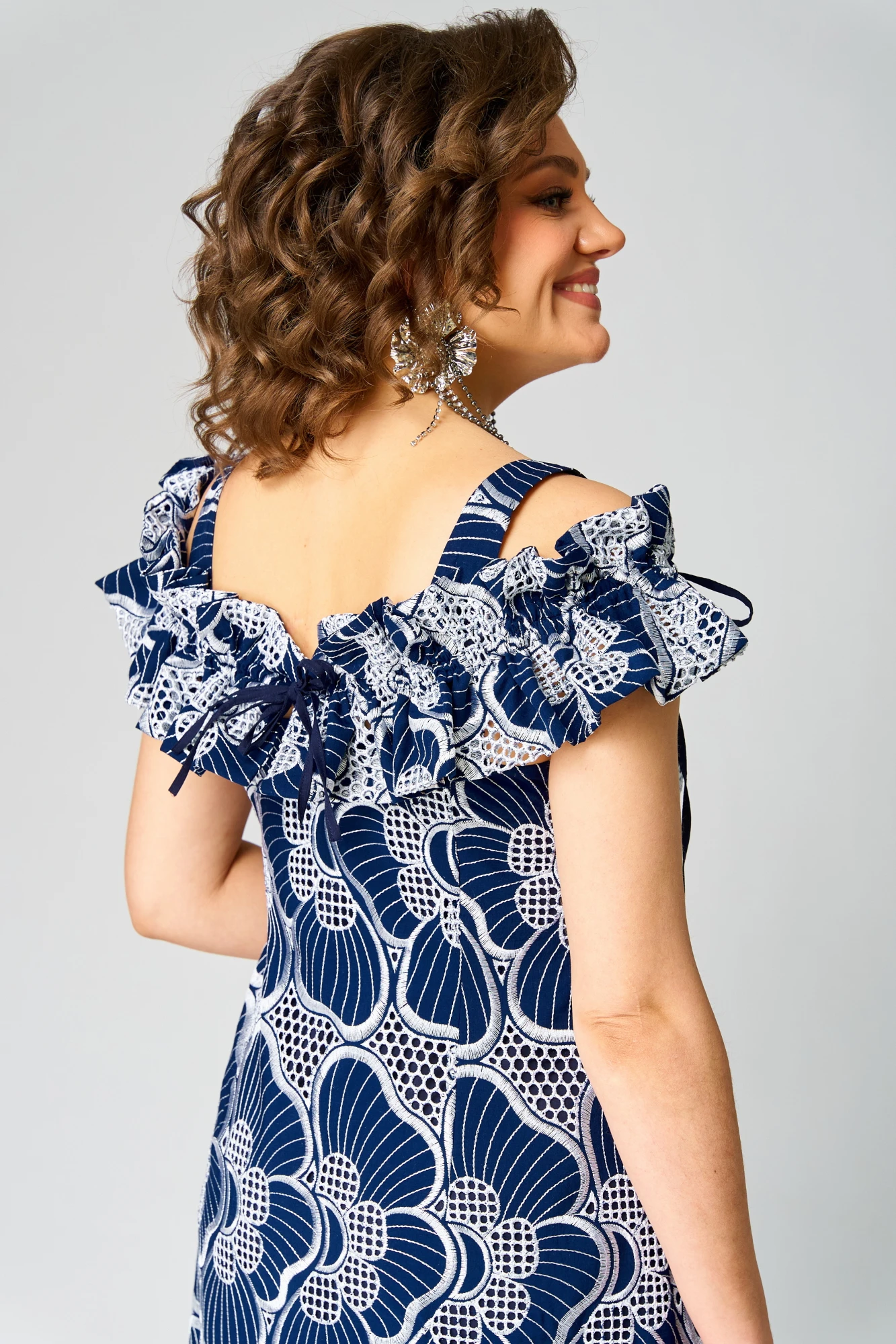 54, 56Платье полуприлегающее А-силуэта на тонких бретелях с застежкой. Горловина по переду V-образной формы. По переду нагрудные вытачки, а спинка - с рельефами. Застежка на потайную молнию в боковом шве. В комплекте съемные бретели из основной ткани, декорированные рюшей."