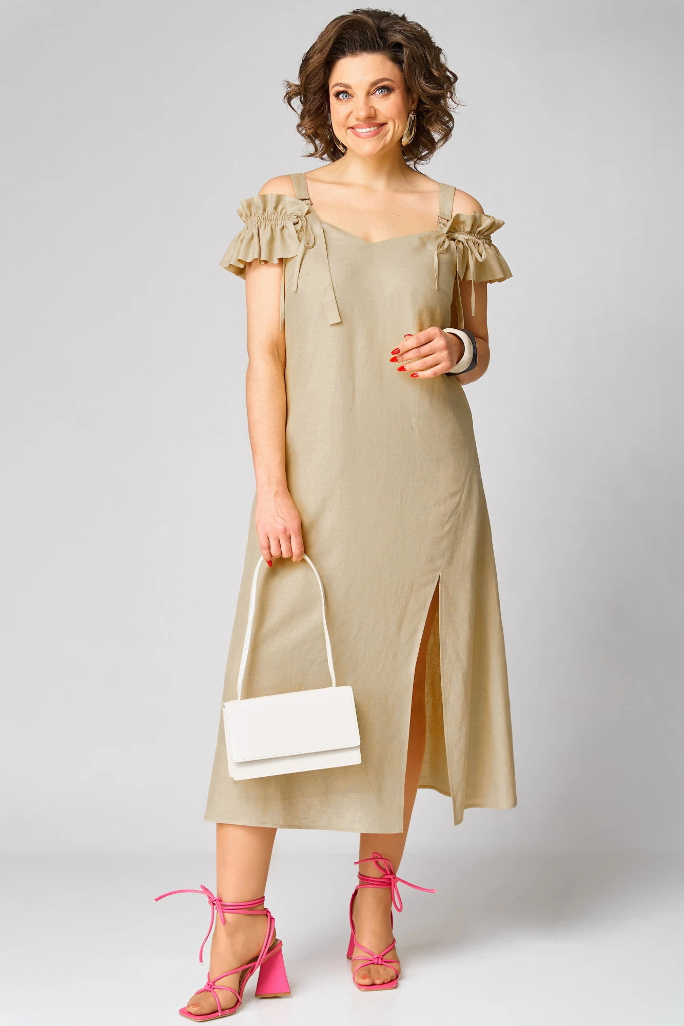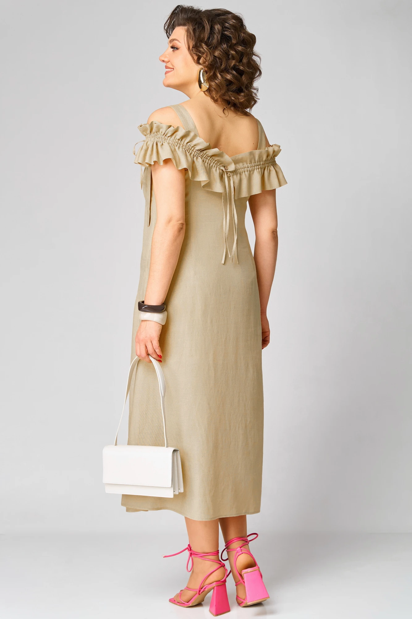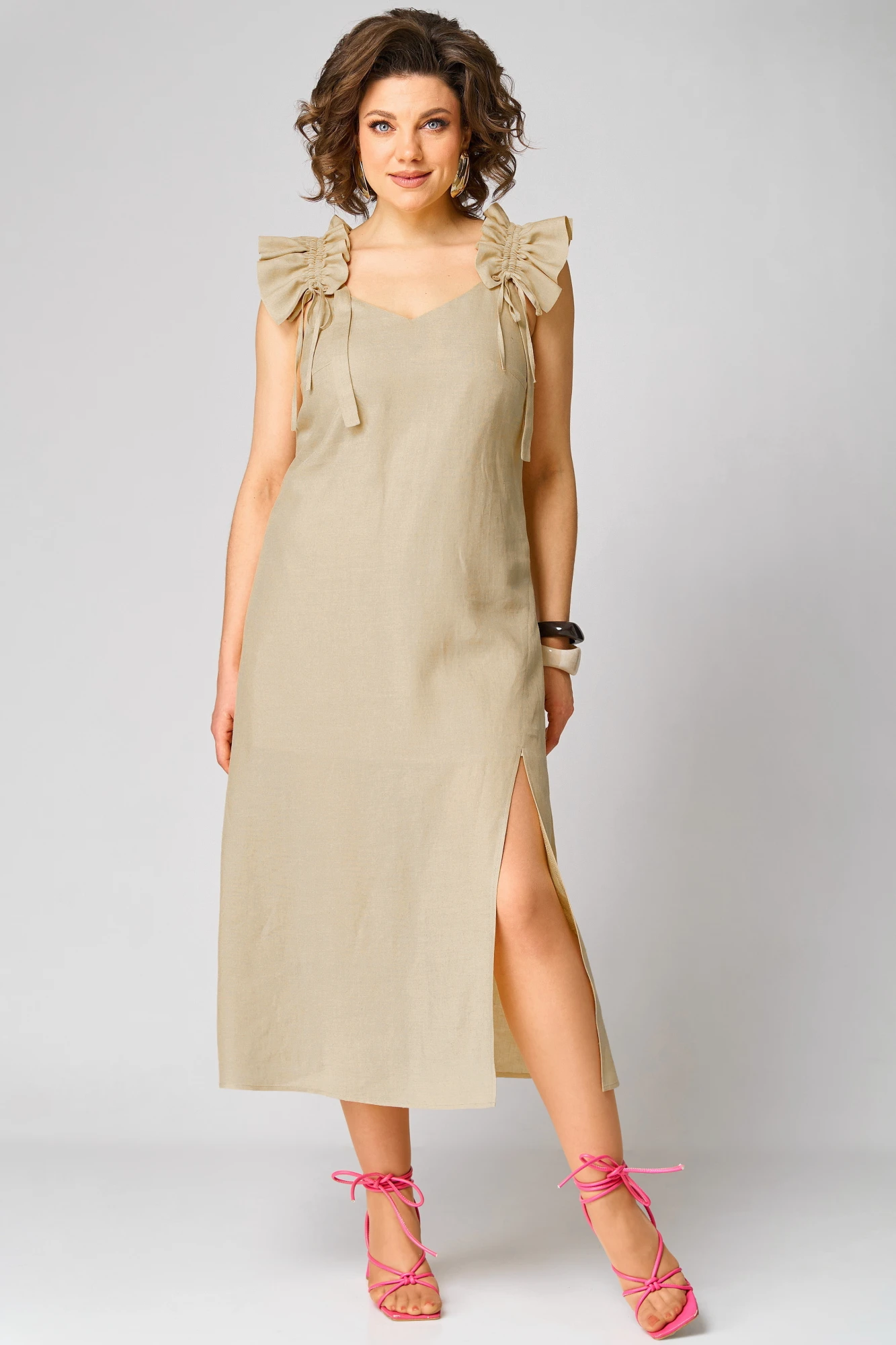 Платье полуприлегающее А-силуэта на тонких бретелях с застежкой. Горловина по переду V-образной формы. По переду нагрудные вытачки, а спинка - с рельефами. Застежка на потайную молнию в боковом шве. В комплекте съемные бретели из основной ткани, декорированные рюшей."