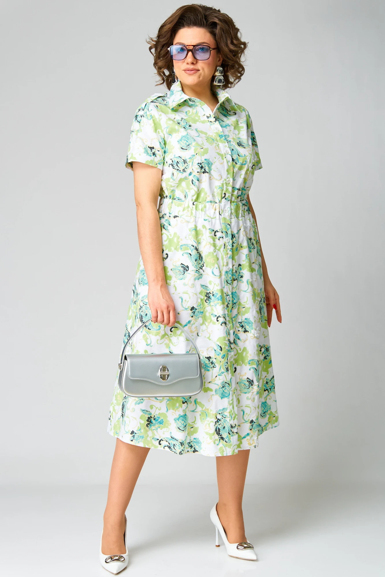 Платье полуприлегающего силуэта, расклешенное книзу. Воротник отложной, на притачной стойке. Платье отрезное по линии талии, на широкой резинке. Платье с центральной застежкой на петли и пуговицы на притачных планках. Полочка с нагрудными вытачками. В боковых швах юбки функциональные карманы. Рукав втачной короткий с широкой декоративной патой, понизу — притачная манжета."