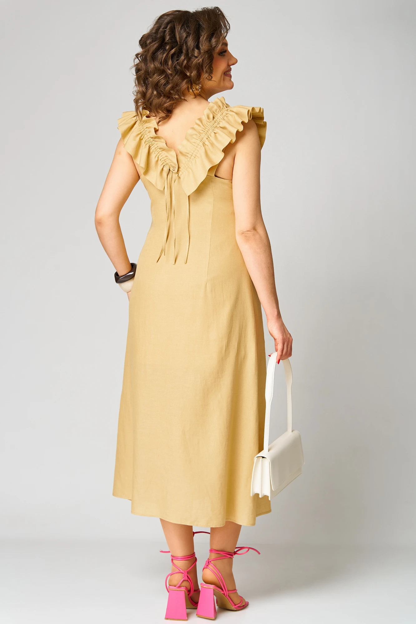 Платье полуприлегающее А-силуэта на тонких бретелях с застежкой. Горловина по переду V-образной формы. По переду нагрудные вытачки, а спинка - с рельефами. Застежка на потайную молнию в боковом шве. В комплекте съемные бретели из основной ткани, декорированные рюшей."