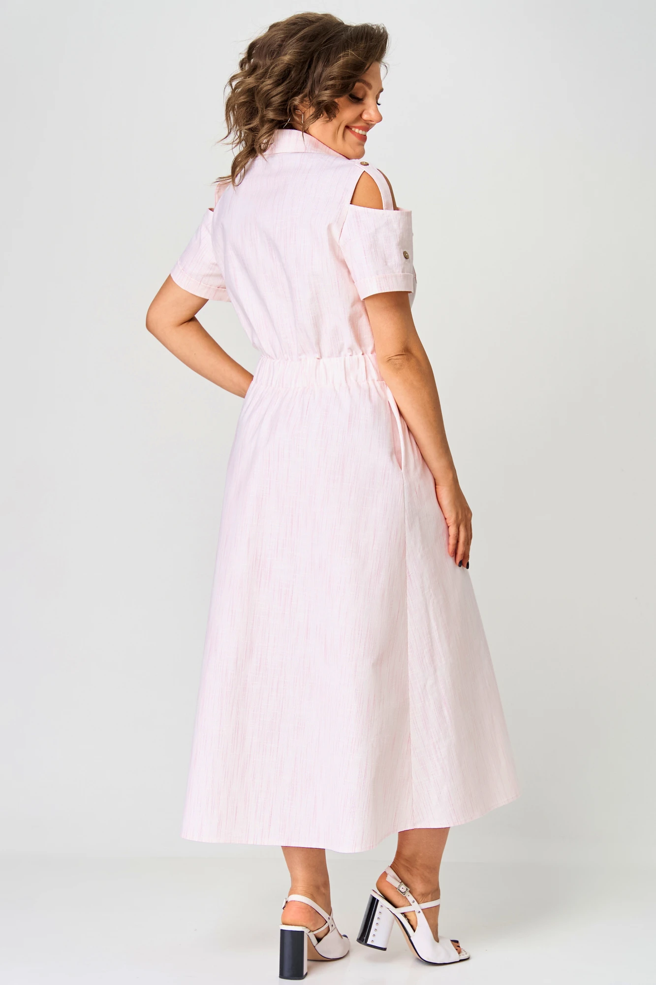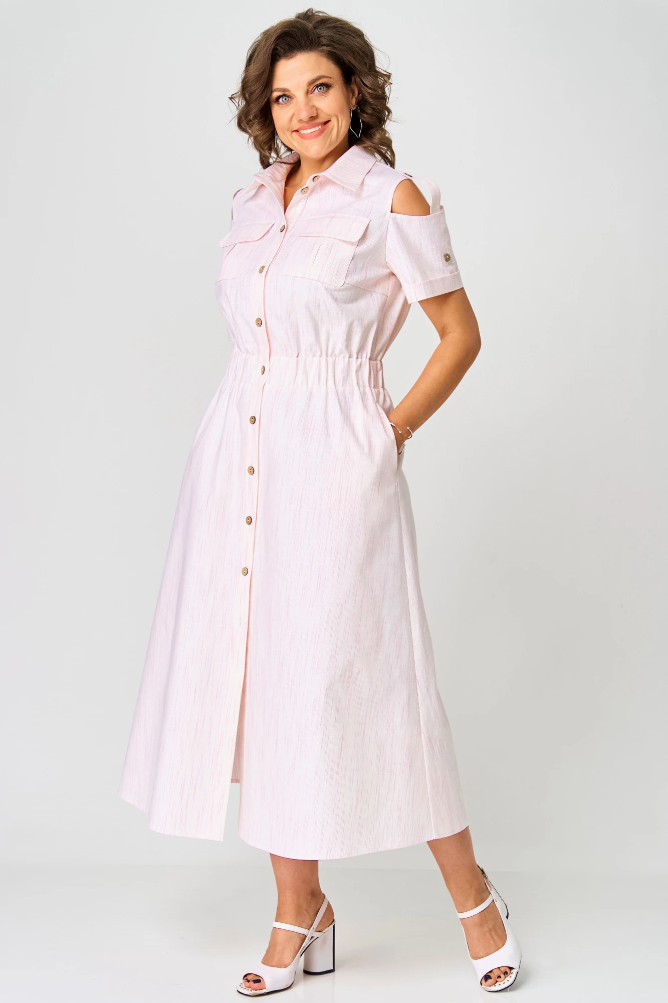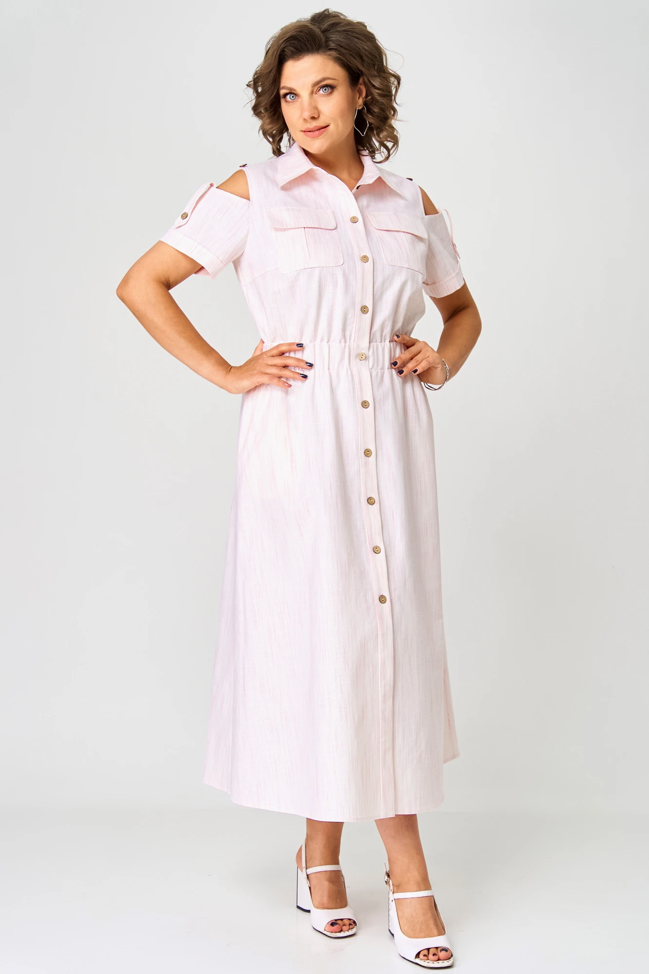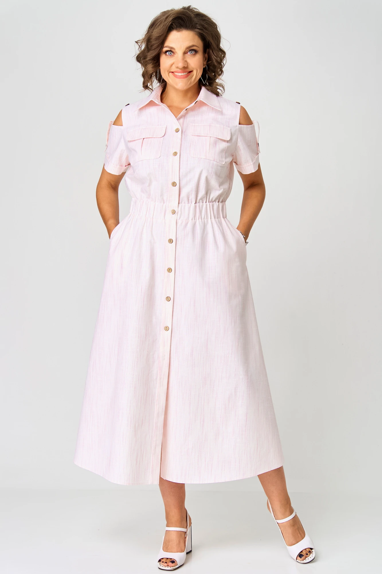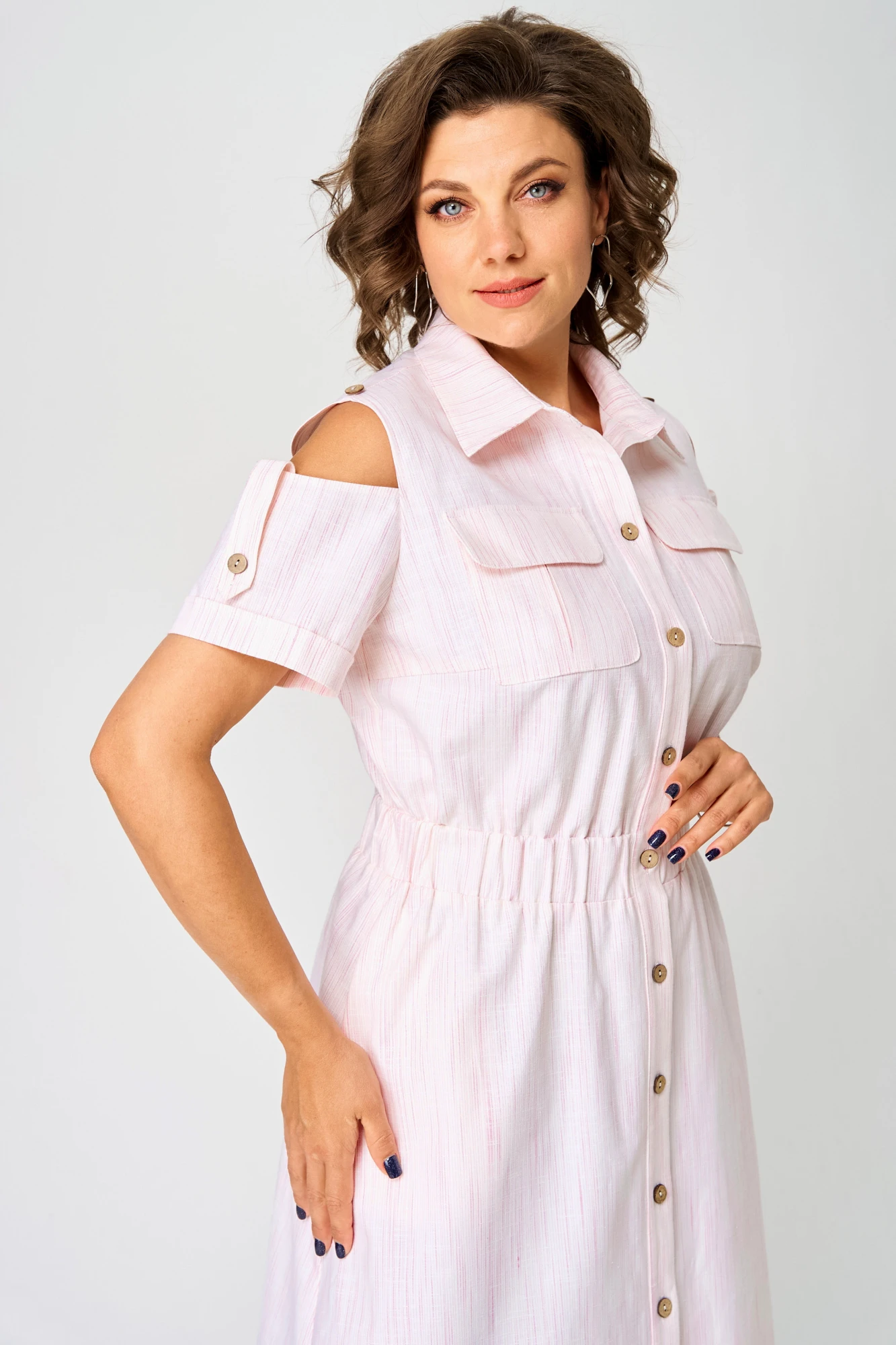 Платье полуприлегающего силуэта, расклешенное книзу. Воротник отложной, на притачной стойке. Платье отрезное по линии талии, на широкой резинке. Платье с центральной застежкой на петли и пуговицы на притачных планках. Полочка с нагрудными вытачками и накладными карманами со складкой и клапаном. В боковых швах юбки функциональные карманы. Рукав втачной короткий, с открытым плечом, понизу - притачная манжета и декоративная пата на пуговице."