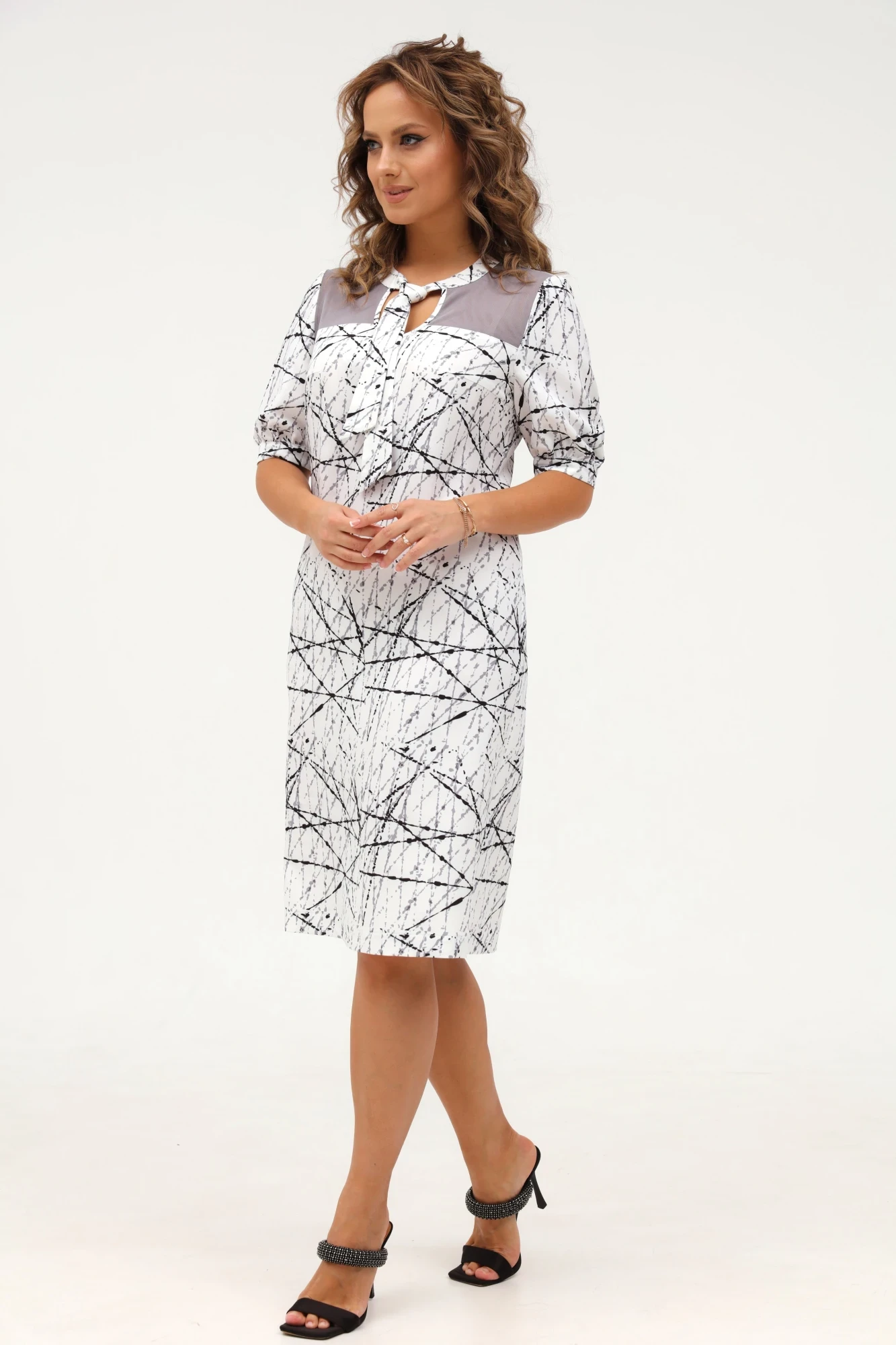 48, 50 , 52Платье полуприлегающего силуэта. Горловина платья округлой формы, обработана широкой обтачкой, переходящей по переду в завязки, имитирующее галстук. Перед с нагрудными вытачками, в верхней части расположена кокетка из сетки. Спинка с талиевыми вытачками и застежкой молнией от горловины в среднем шве. Рукав короткий втачной, по низу - замкнутая манжета со сборкой."
