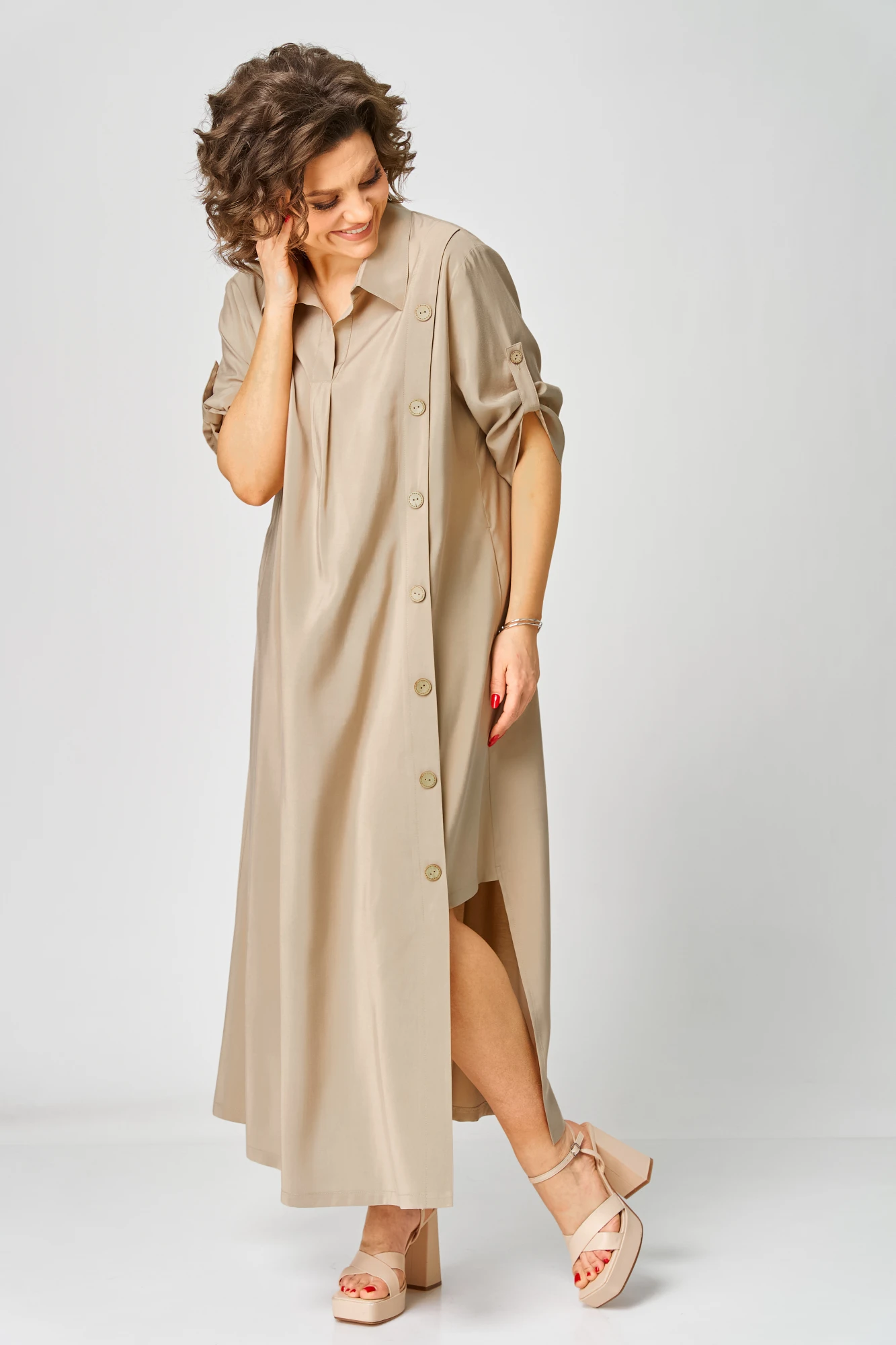 Платье умеренного «А» силуэта, свободный крой, что позволяет рекомендовать их женщинам с самыми разными типами фигур. Плечо слегка спущенное, рукав рубашечный ниже локтя, на пате. По горловине отложной воротник со стойкой. В боковых швах, для удобства, выполнены карманы. Длина макси, идеально подходит для любого типа фигуры и стройнит ее.