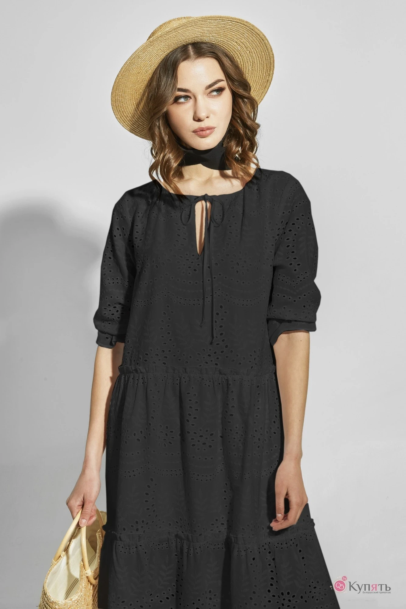 Платье женское нарядное, свободного силуэта, из текстильной хлопковой ткани с вышивкой. Платье отрезное по линии талии, воланом по низу. Перед с застежкой на завязки. Вырез горловины обработан подкладкой. Рукав втачной 3/4 по низу с воланом. Платье на хлопковой подкладке.