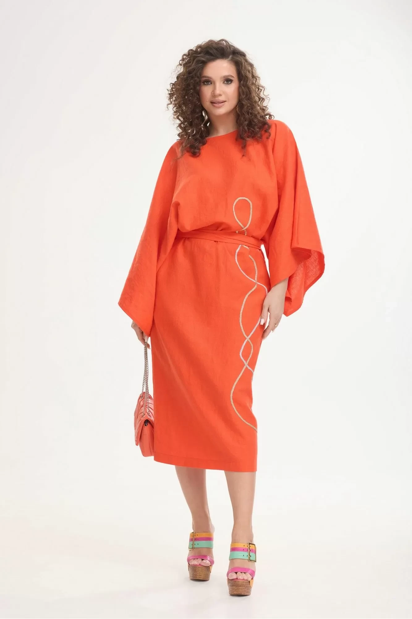 Платье женское, дизайнерского силуэта. Нижняя часть с разрезом в среднем шве спинки. Горловина "лодочка". Рукава цельнокроеные, широкие, типа "кимоно". В боковые швы вставлены полупояса из основной ткани. Перед декорирован отделочной тесьмой.
