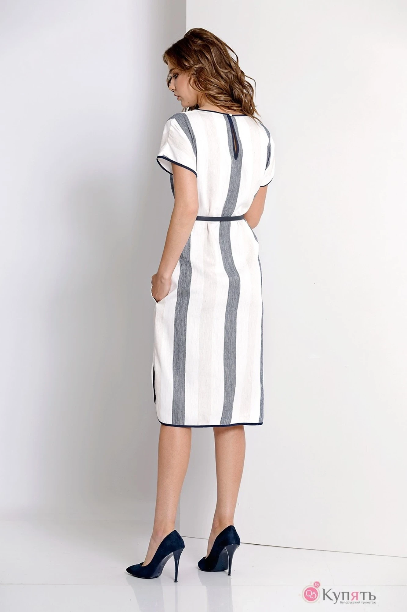Платье выполнено из ткани в полоску, свободного кроя, карманы в боковых швах, застежка на пуговицу сзади. Ремень идет в комплекте.