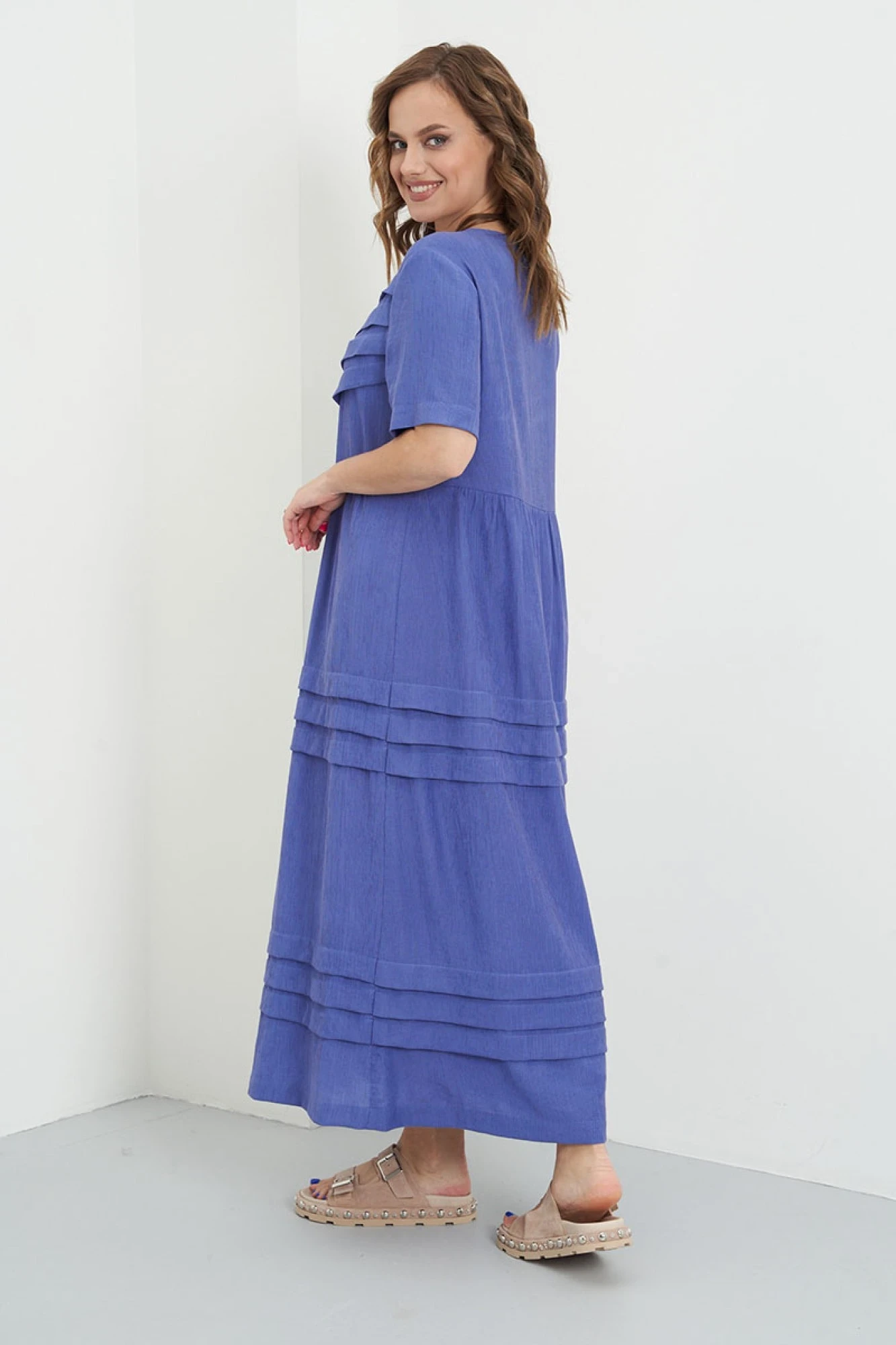 50,52Платье отрезное выше линии талии с коротким втачным рукавом выполнено из практичной лёгкой ткани с эффектом жатого полотна. Платье с круглым вырезом горловины и минимальными сборками по линии членения.