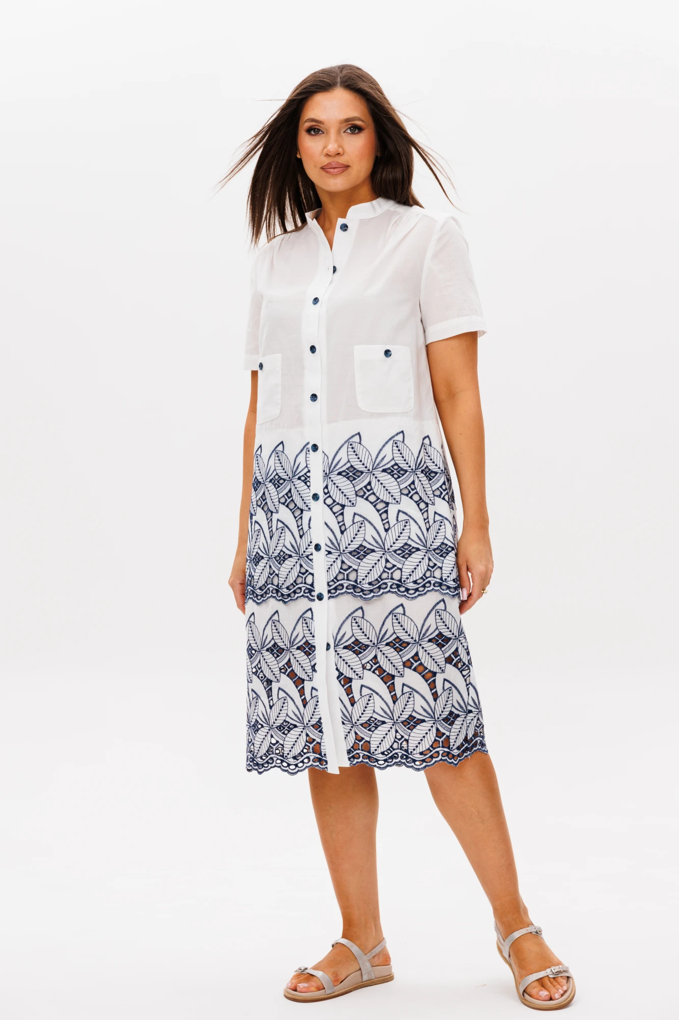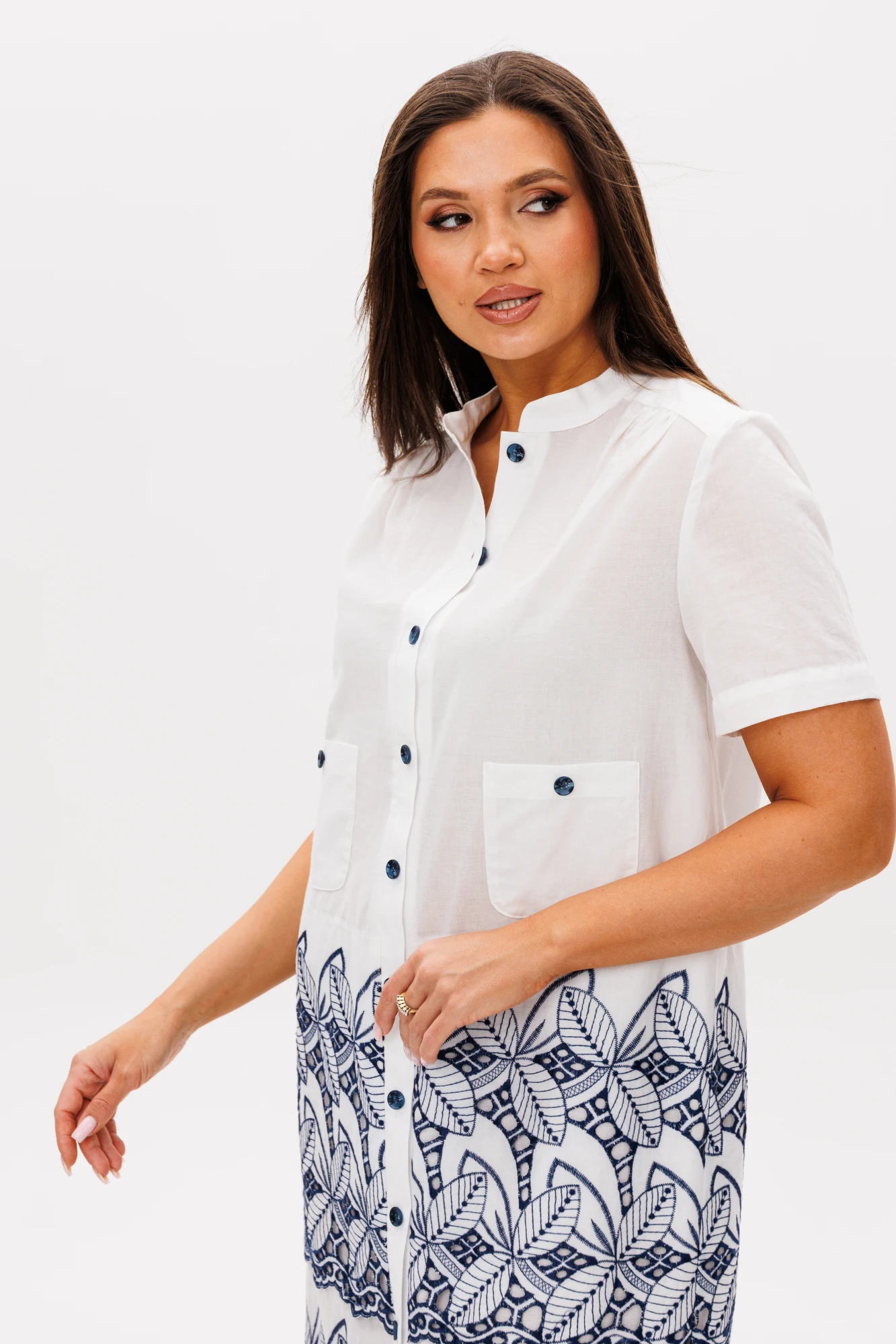 Прямой силуэт, втачной покрой, центральная застежка на петли и пуговицы, воротник-стойка. Полочка и спинка двойные от линии талии до 3/4 бедра. Полочка с отрезной кокеткой со сборкой и накладными карманами. Спинка с отрезной кокеткой и сборкой. Модель дополнена Контрастными пуговицами.
