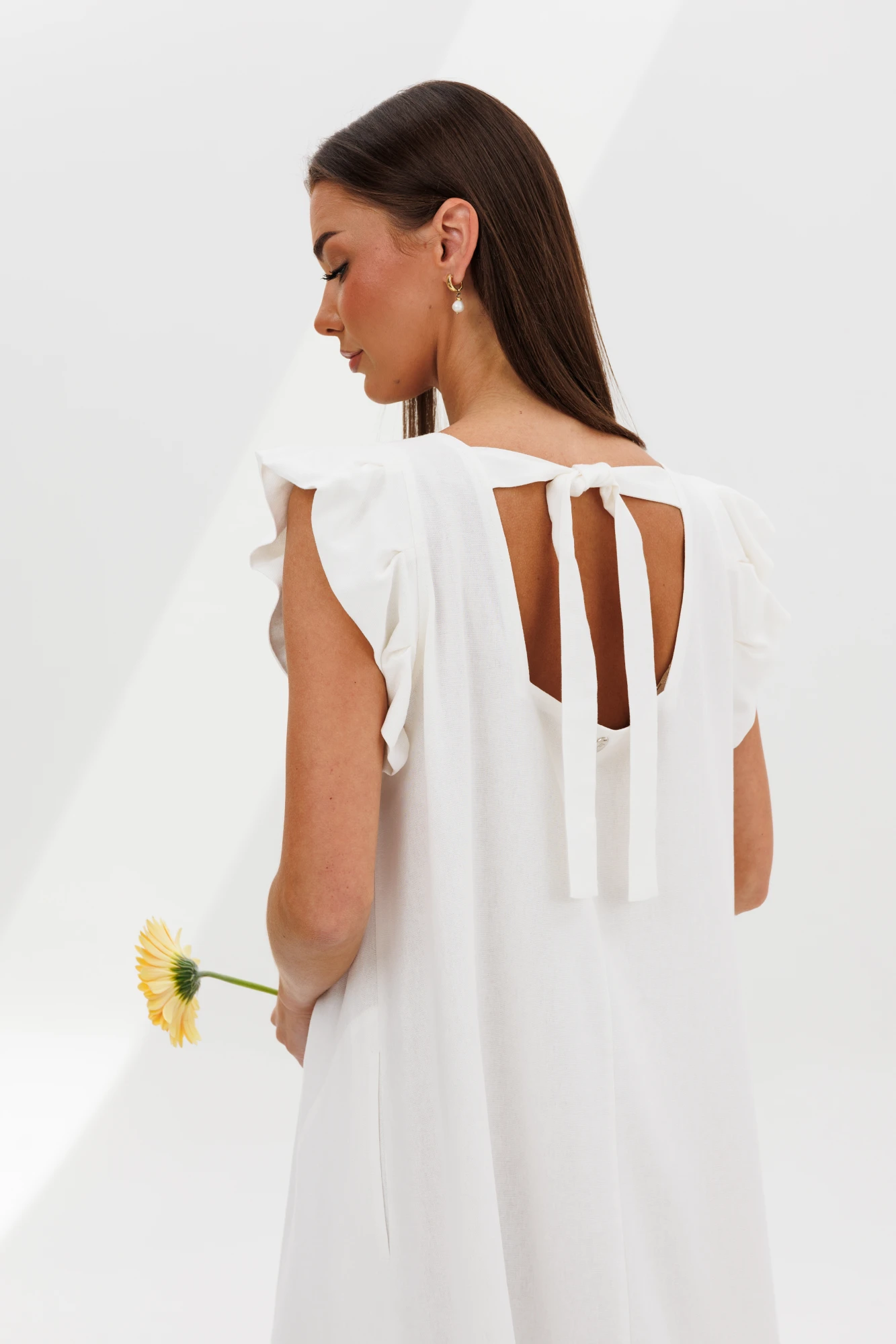 Свободный А-силуэт, изящный V-образный вырез, романтичное крылышко, комфортная длина миди. Полочка с нагрудной вытачкой и карманом в боковом шве. Спинка со средним швом, вырезом каре и эффектной завязкой, удерживающей линию горловины.