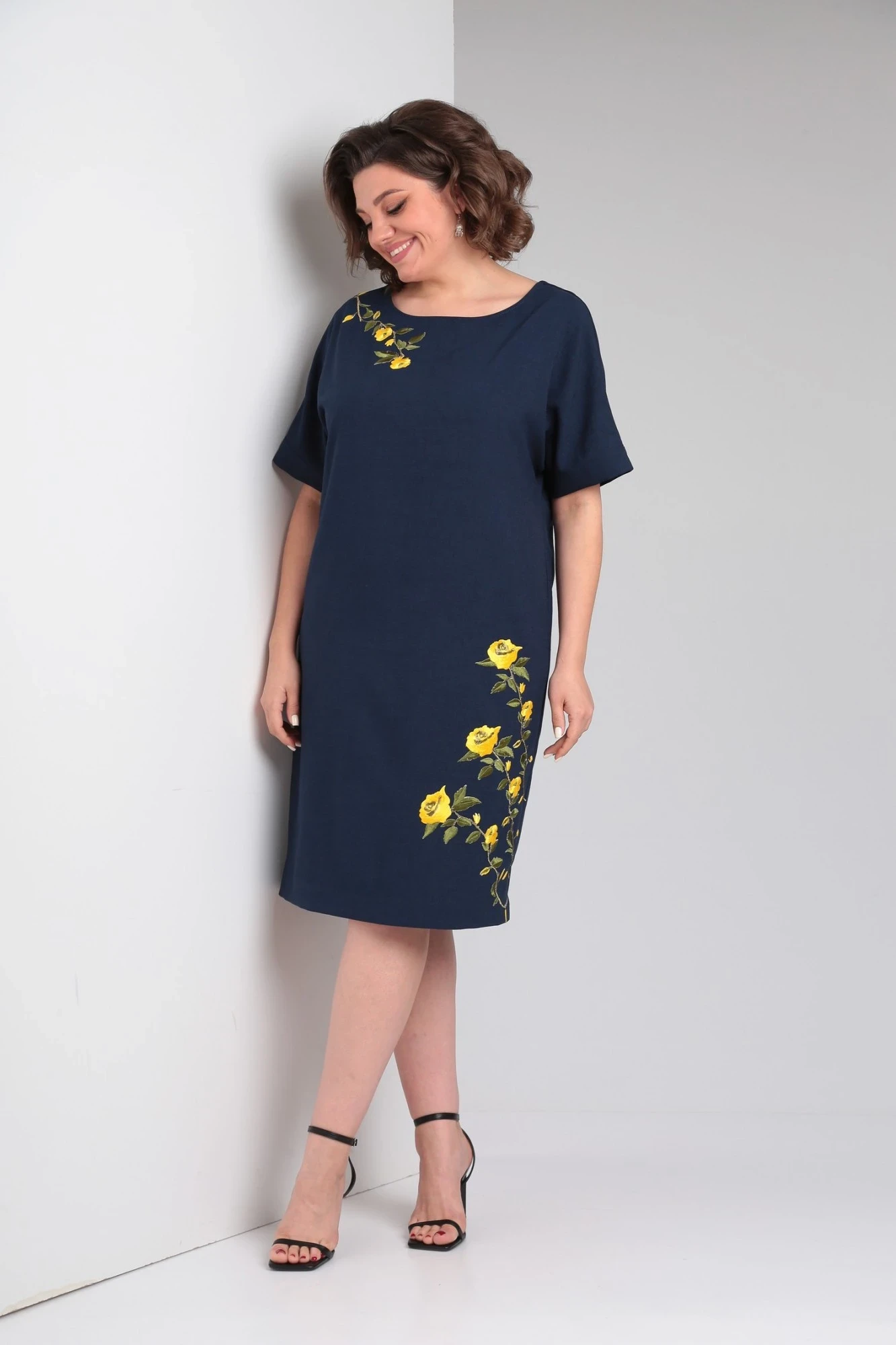 60Полочка платья прямая, без вытачек. Горловина округлая, слегка расширена. Рукав короткий, реглан. Полочка платья украшена вышивкой. Спинка однотонная, со средним швом. В верху среднего шва треугольный вырез с перемычкой. Снизу среднего шва щлица. Платье без подкладки.