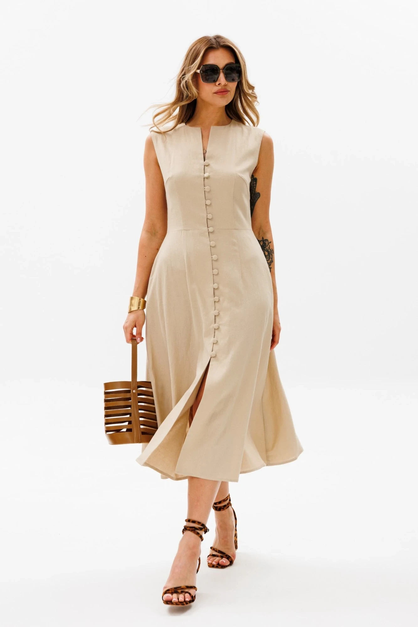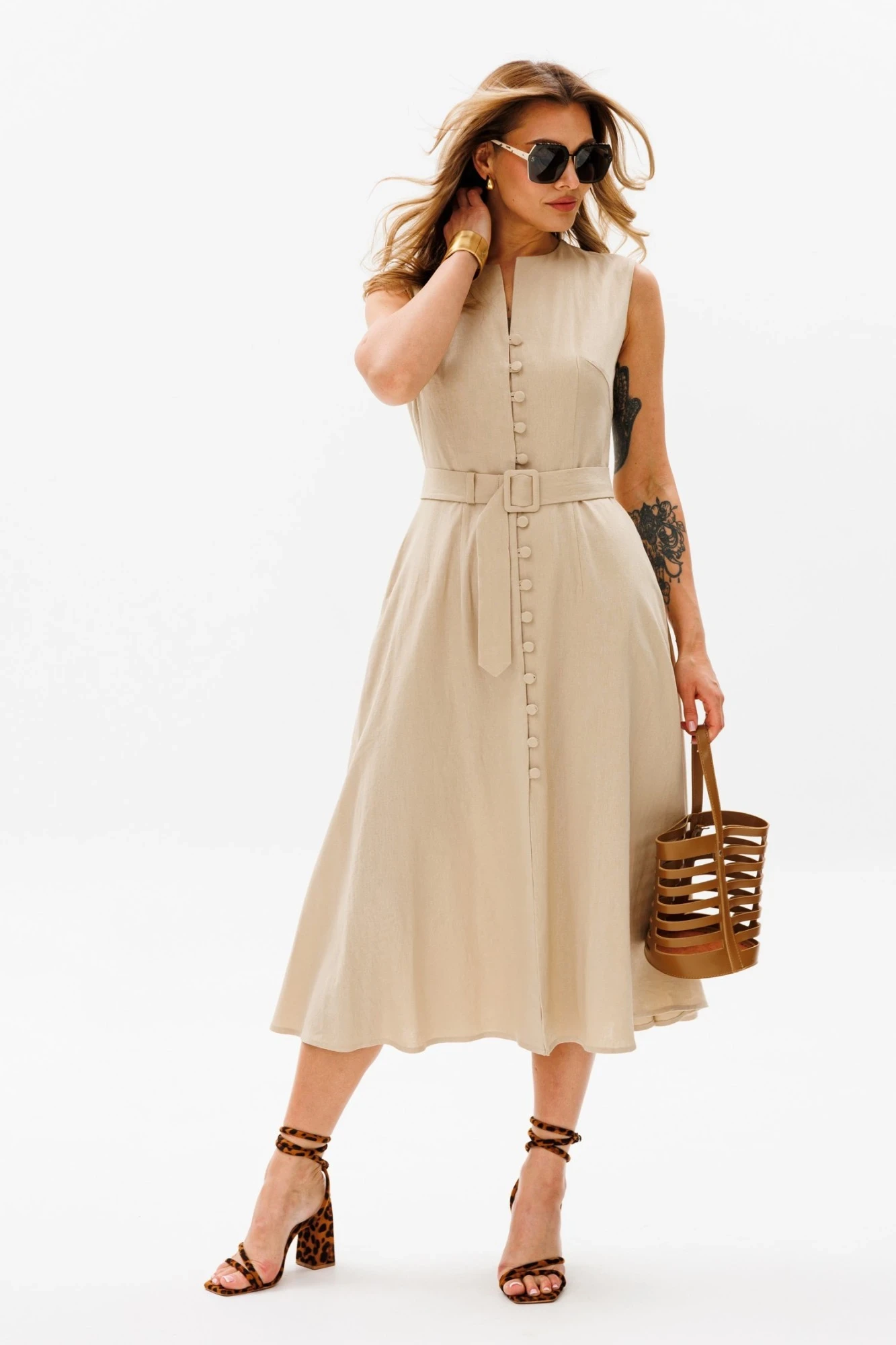 44,46,48,50,52, 54Платье приталенного силуэта, расширенное к низу, отрезное по линии талии. Застёжка центральная на навесные петли и пуговицы. Вырез горловины фигурный. Без рукава, проймы обработаны косой бейкой. В боковом шве функциональные карманы. Платье без подкладки. В комплекте пояс из основной ткани, с пряжкой.