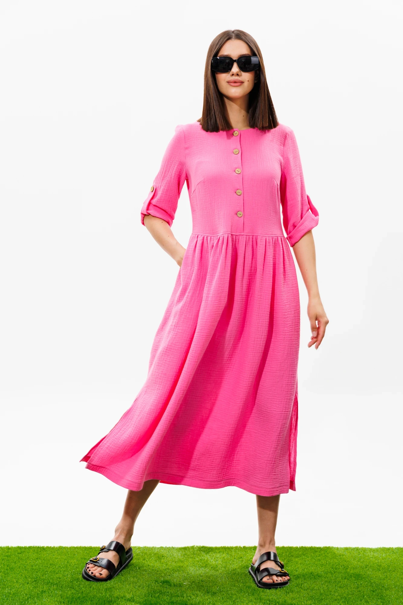 48,50,52,54Полочка и спинка платья отрезные по линии талии. Спереди расположены наклонные горизонтальные нагрудные вытачки и фронтально-вертикальная бортовая застежка на петли-пуговицы.