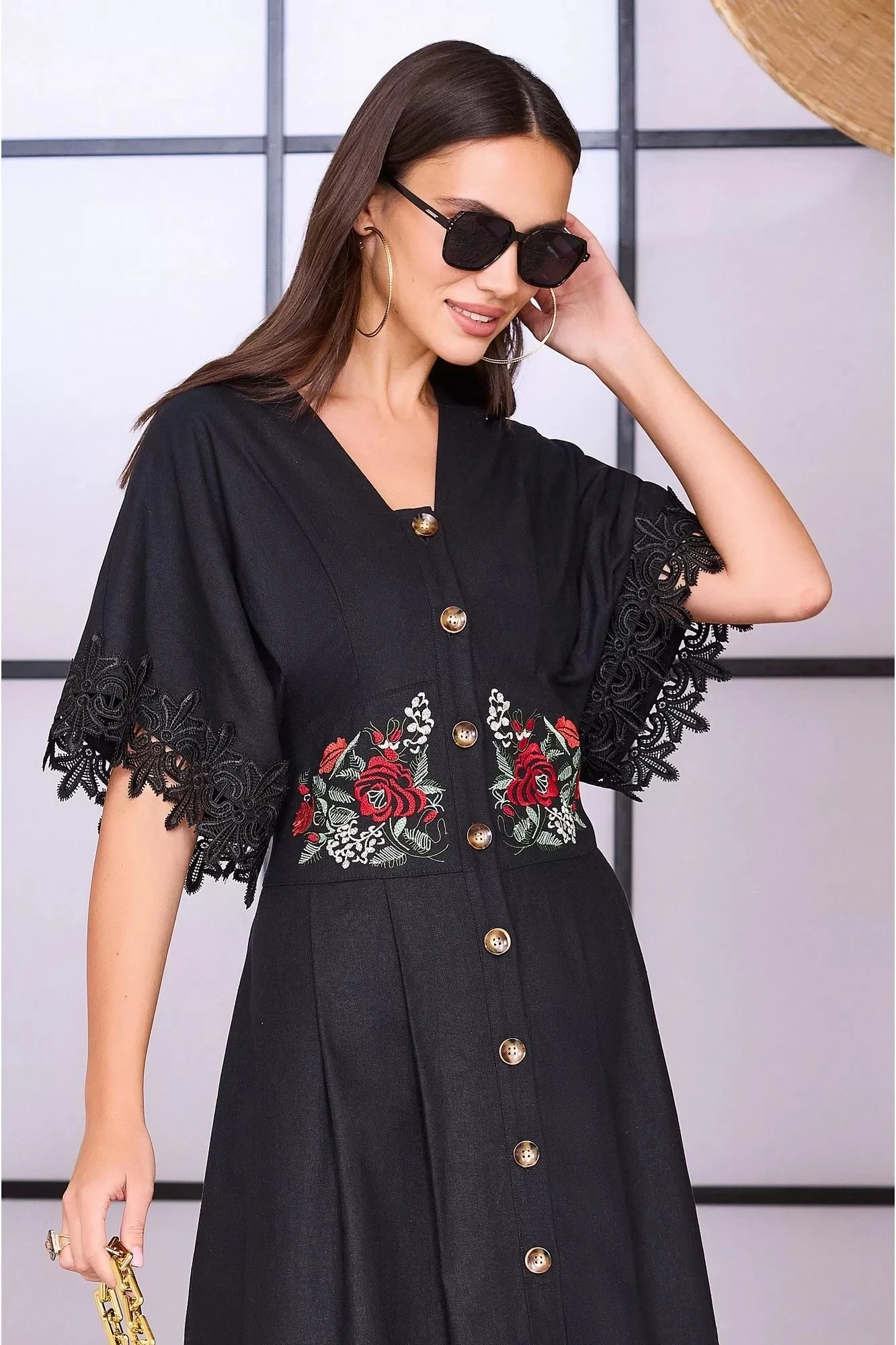 Льняное платье «Boho» миди с вышивкой и кружевом. Платье на основе цельнокроеного покроя с втачным поясом, на лифе и юбке застрочены мягкие складки. Перед с V-образным вырезом и центральной застежкой на петли и пуговицы. Спинка со средним швом и талиевыми вытачками, в боковые швы вставлены завязки пояса. Рукав цельнокроеный с настроченным кружевом. Юбка на х/б подкладке.