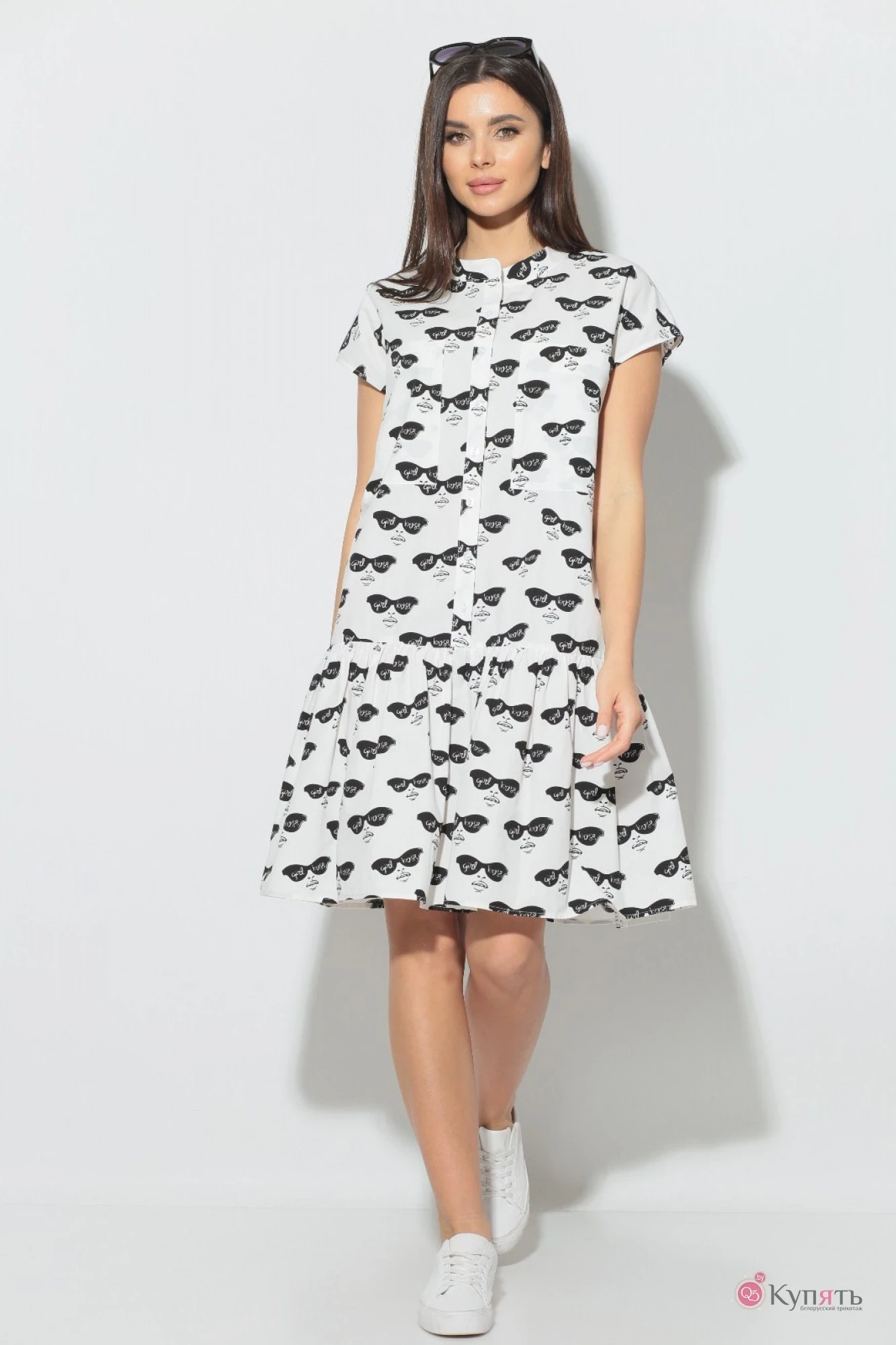 Молодежное платье выполненное из хлопчато-бумажной ткани.Платье прямого силуэта со спущенным плечом,притачным валаном по низу изделия.По переду накладные карманы.Застежка-поло на петли-пуговицы и вортник стойка.