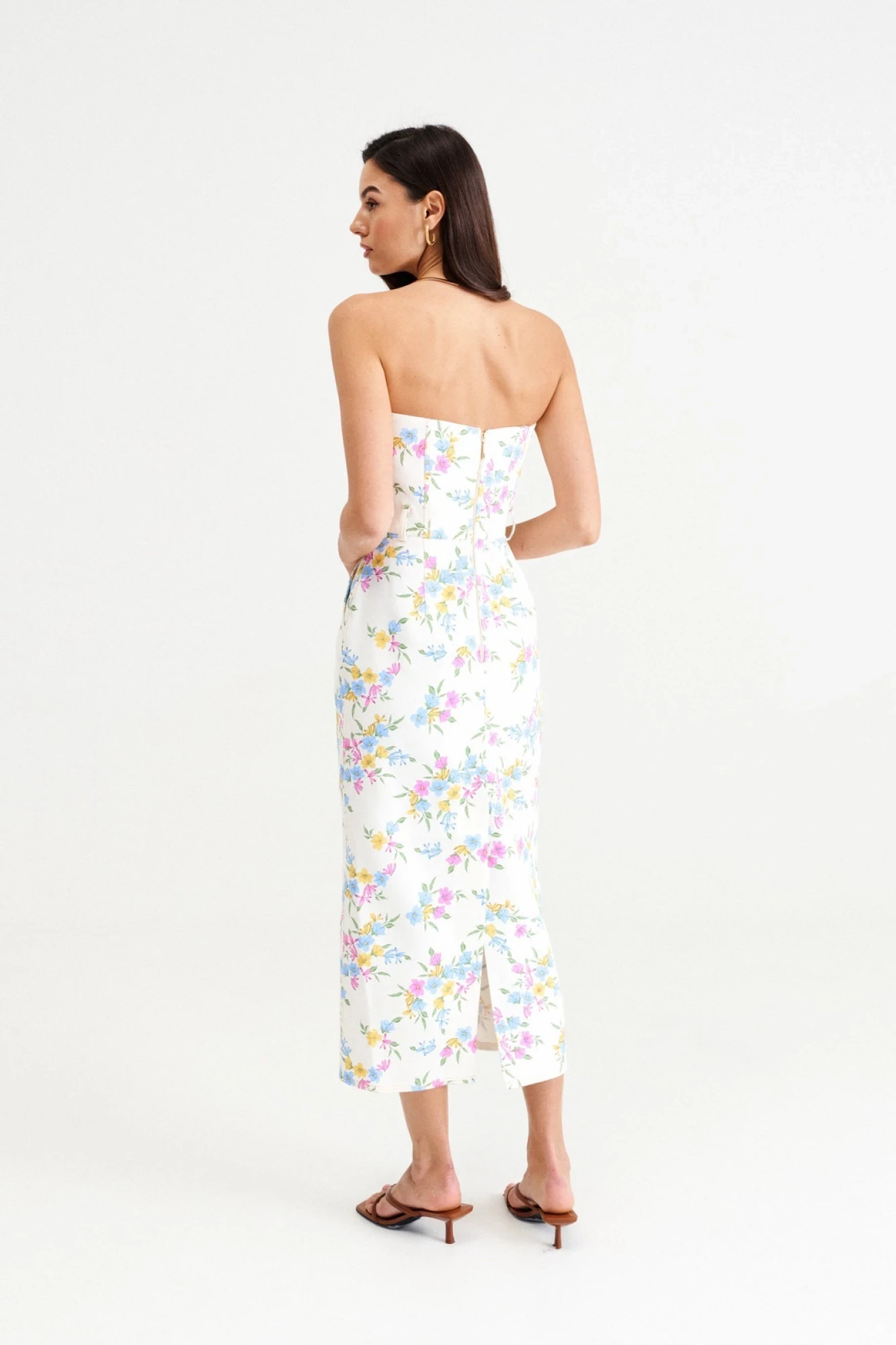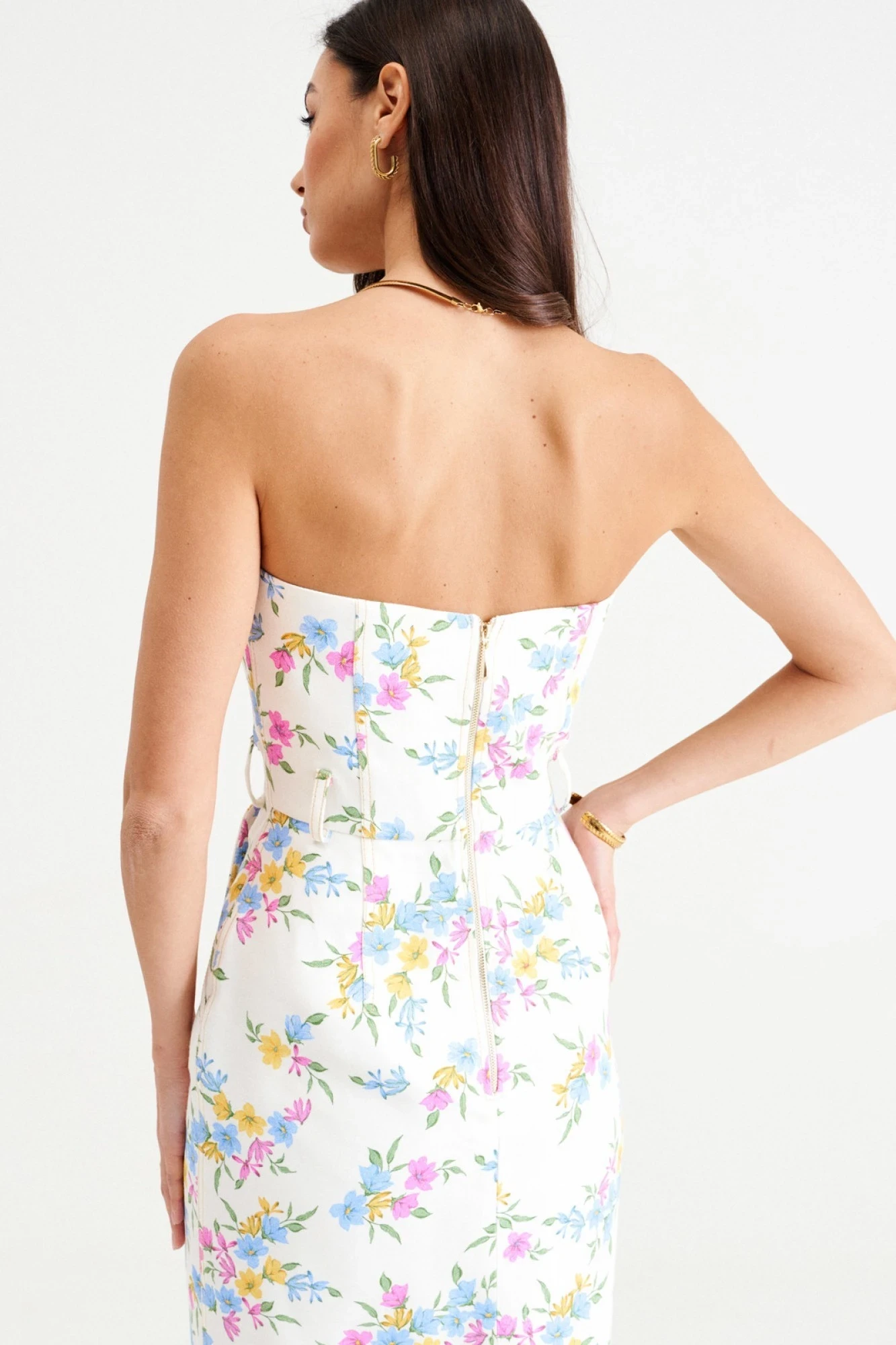 Молочный деним с акварельными цветами красиво подчеркивает загорелую кожу и создает элегантный женственный силуэт.
