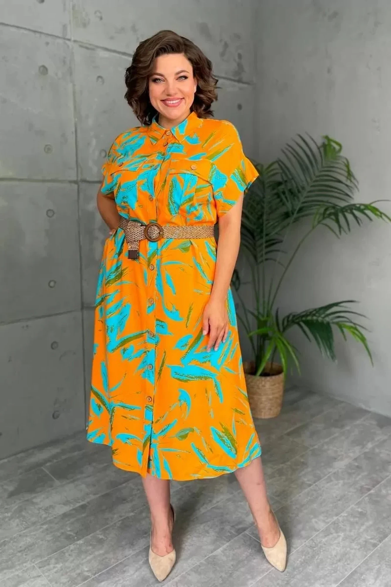 Платье женское из текстильной ткани, полуприлегающего силуэта. По переду платья расположена притачная планка с петлями-пуговицами. На груди расположены накладные карманы с клапанами. Спинка прямая,спущенное плечо. Пройма платья обработана манжетой. Вырез горловина оформлен воротником со стойкой. В боковых швах расположены карманы. Пояс входит в комплект.