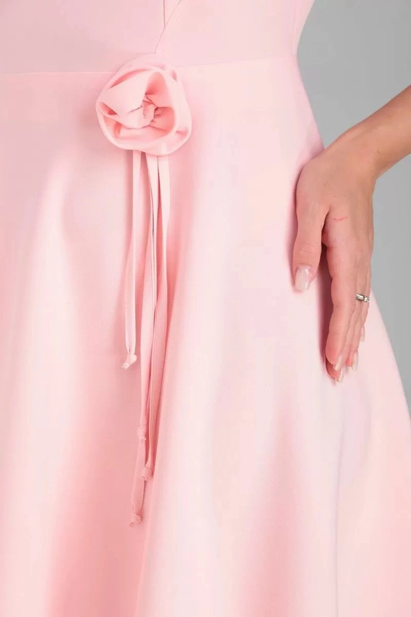Платье выполнено из яркой, стрейчевой ткани «барби», хорошо держащей форму.