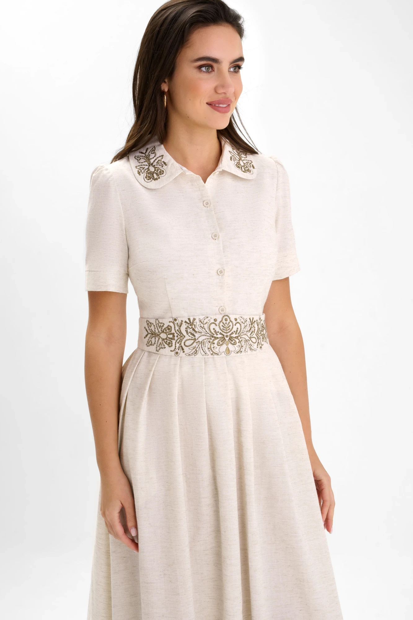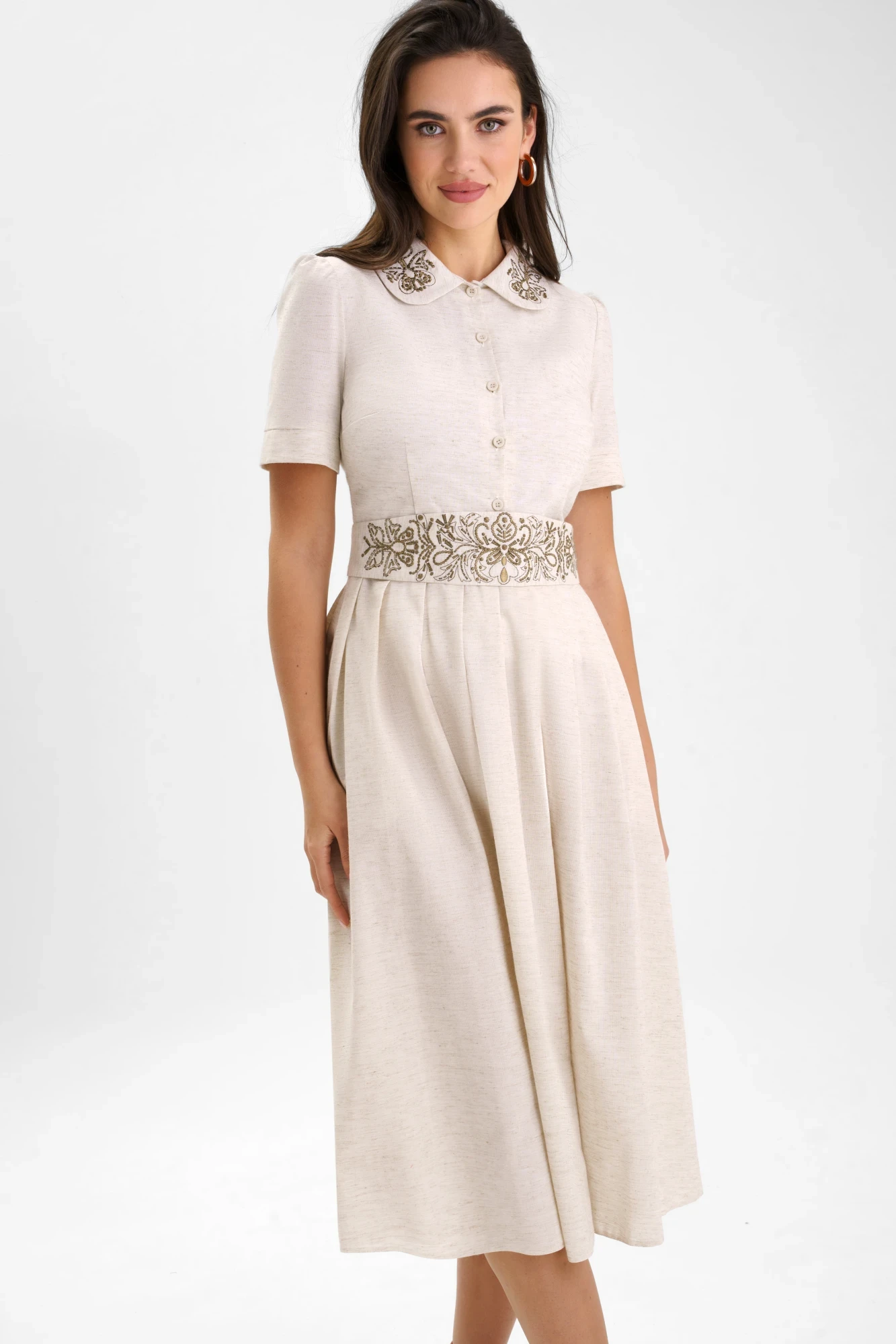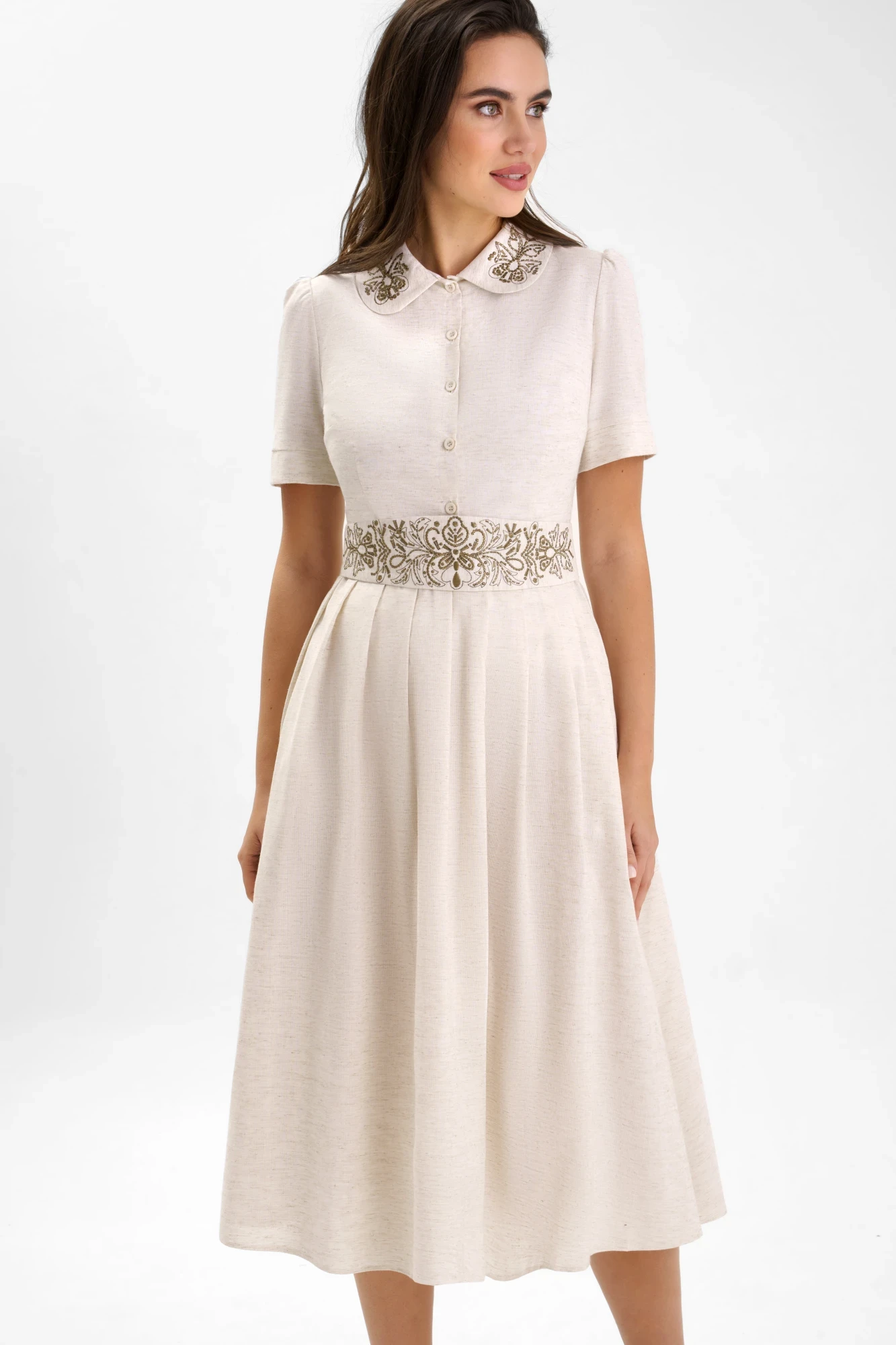 44,46,48,50,52, 54Платье женское полуприлегающего силуэта из смесовой ткани со льном, отрезное по линии талии с притачным поясом и съемным поясом с художественной вышивкой которая поддерживается на воротнике, длиной миди. Съемный пояс застегивается на 2 пришивных крючка. Верхняя часть переда платья разрезная с притачной планкой, которая застегивается на 5 петель и пуговиц (размер и цвет фурнитуры может незначительно отличаться от фото) и нагрудными вытачками, выходящими из бокового шва. Спинка со средним швом. Горловина круглой формы обработана отложным воротником с закругленными концами и вышивкой. Рукава втачные одношовные, короткие с притачной манжетой и небольшой сборкой по окату. Нижняя часть платья прямая со складками направленными в одну сторону, на подкладке. В боковых швах нижней части платья обработаны карманы в шве. По низу платья проложена отделочная строчка на 0,2 см от края.