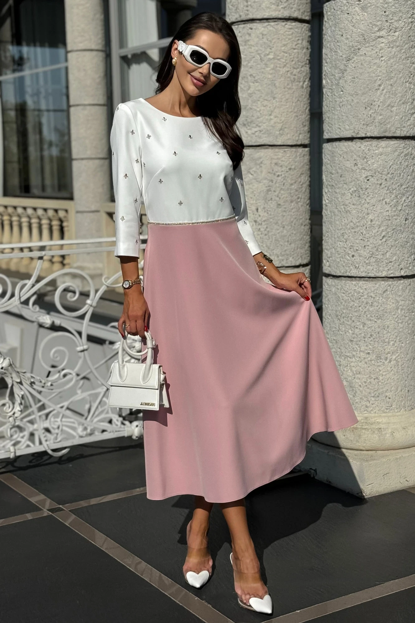 46,48,50,52, 54Платье на подкладке, отрезное по линии талии. Лиф платья и рукава оформлены декоративной вышивкой, низ платья из контрастного однотонна. В боковых швах на уровне линии бедер - карманы. На уровне линии талии по лифу идет декоративная тесьма (тесьма может незначительно отличаться от фото).