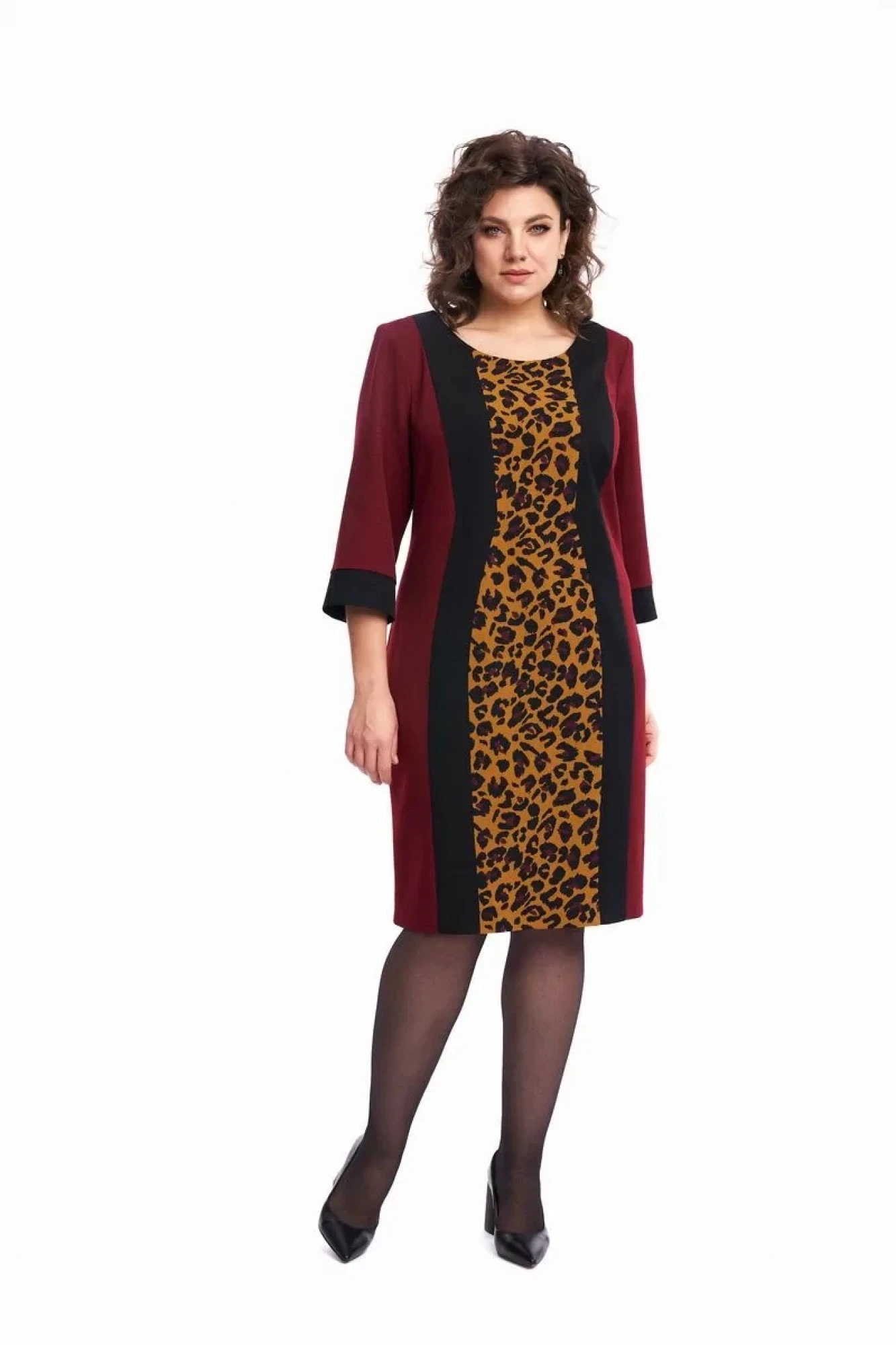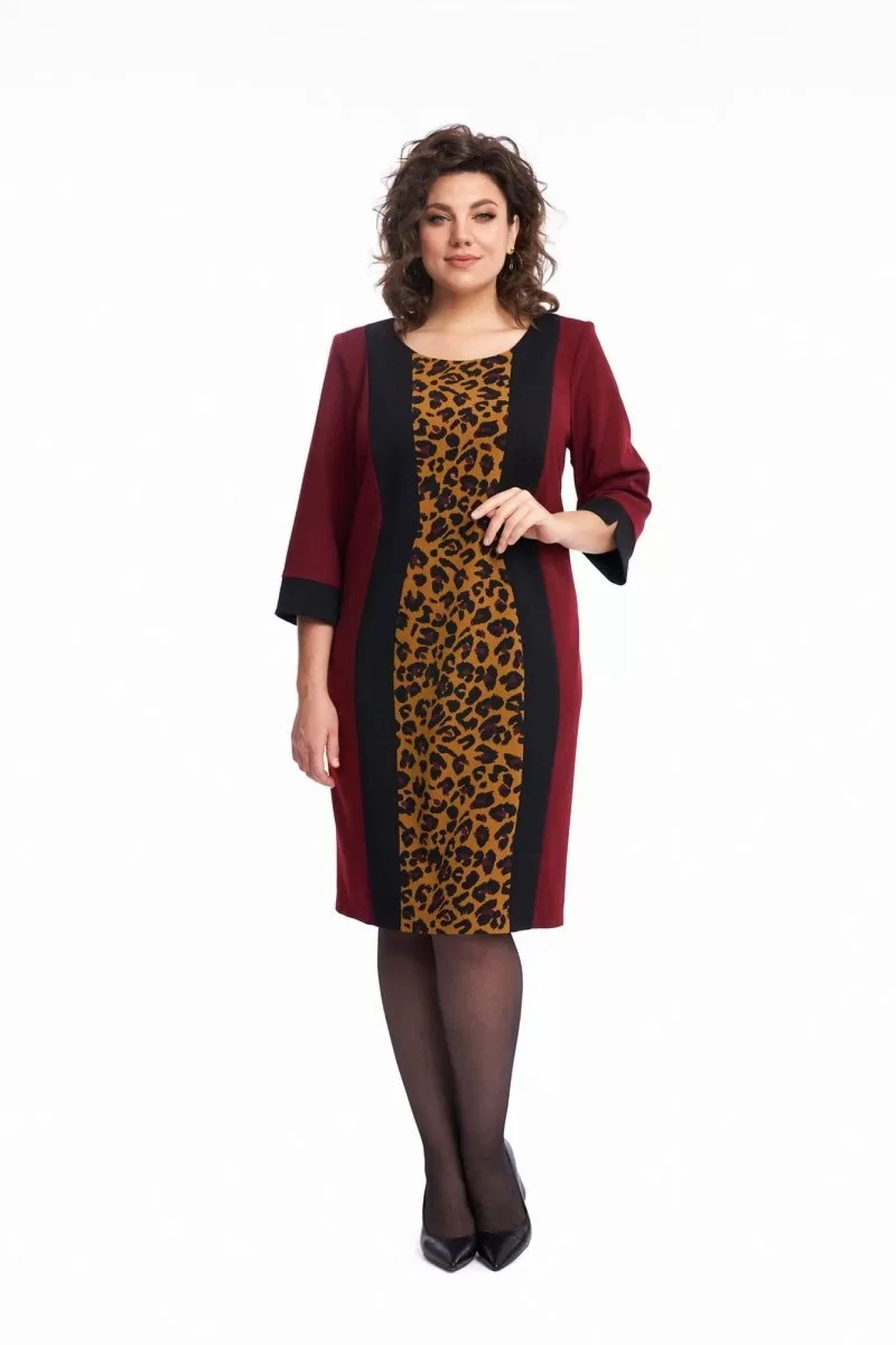 54. Длина платья 98 см, длина рукава 47 см. Параметры модели в 50 размере ОГ 102см, ОТ98см, ОБ 112, параметры в 52 размере ОГ 106см, ОТ 102см, ОБ 116см, параметры в 54 размере ОГ 110см, ОТ 106 см, ОБ 120см.