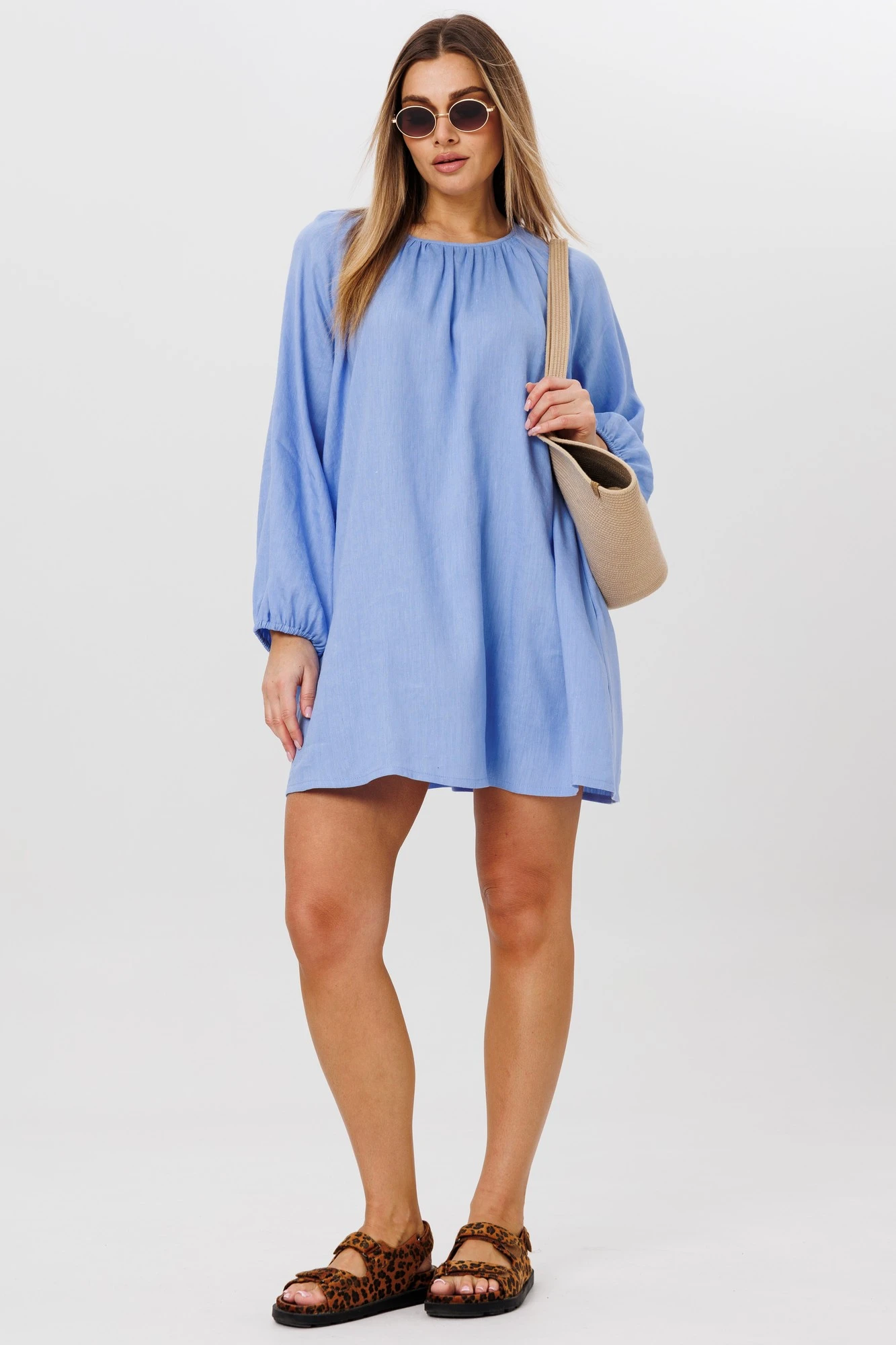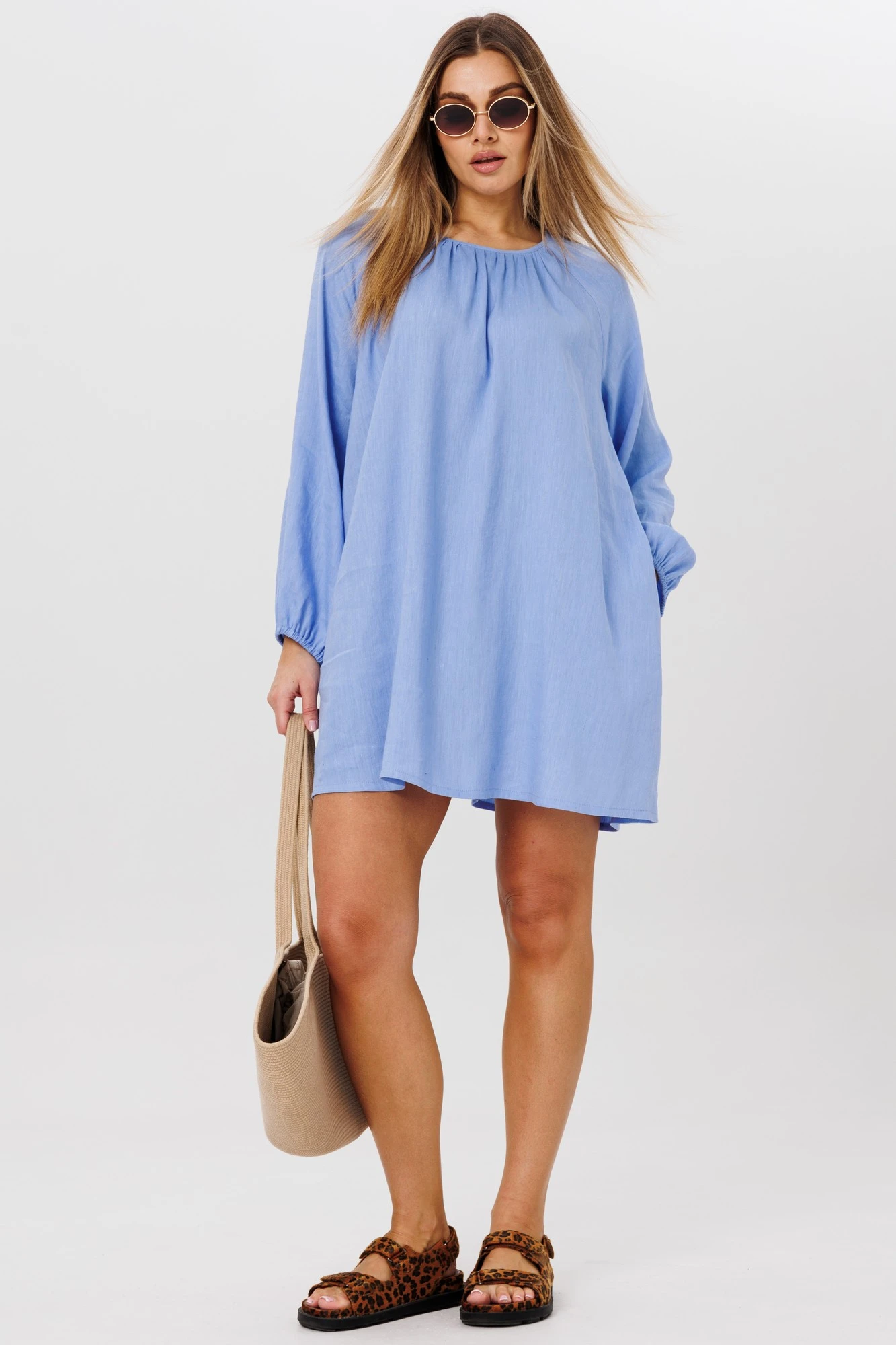 Горловина платья округлой формы со сборкой, обработана окантовкой. Перед и спинка цельные. Рукав реглан, длиный, снизу собран на резинку. В боковых швах функциональные карманы.