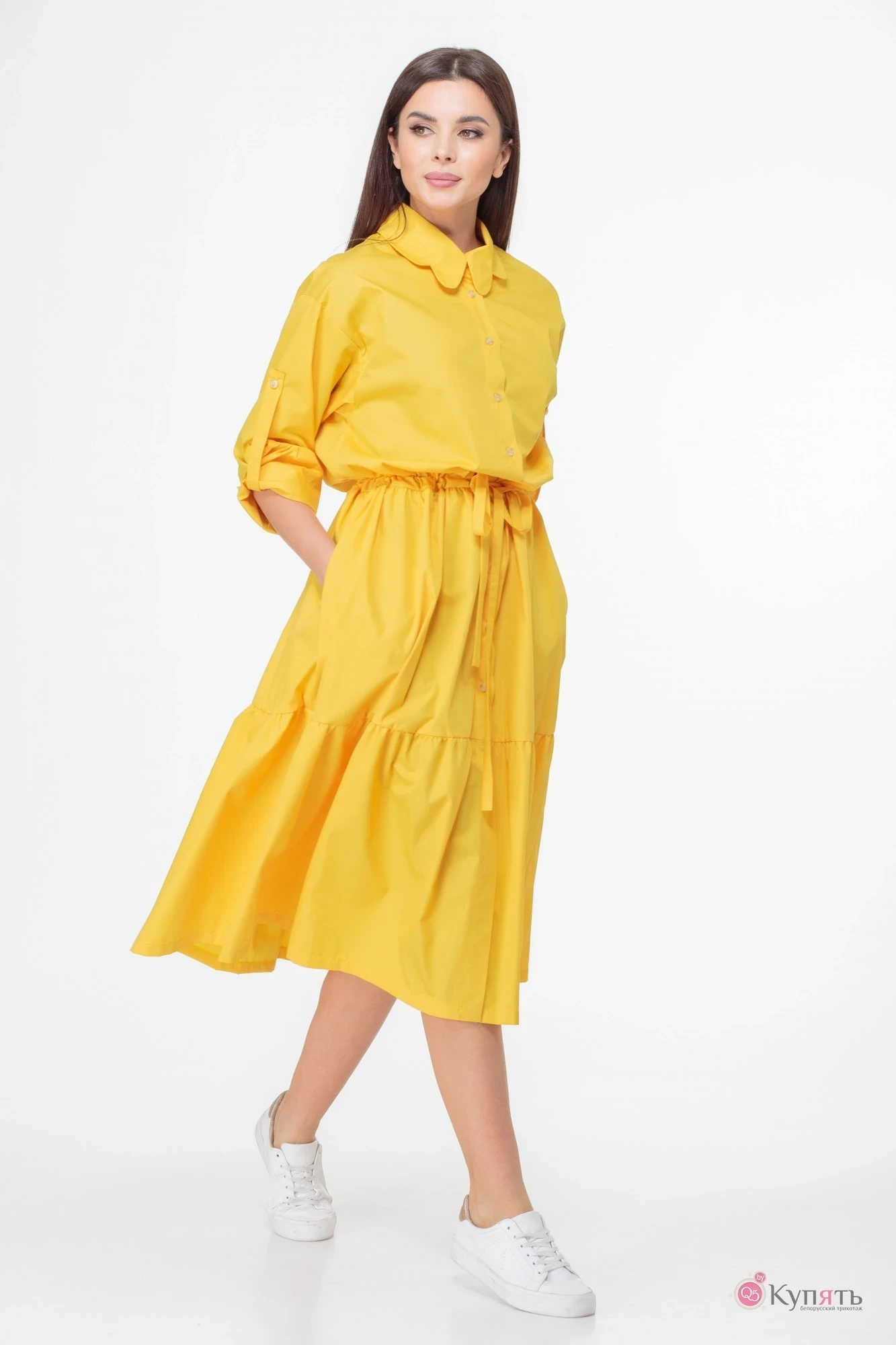 46, 48 , 50 ,52Расширенный крой, слегка заниженная талия, подчёркнута кулиской с завязывающимся поясом, втачные длинные рукава с фигурными манжетами и возможностью регулировать длину. Нижняя часть с двумя присборенными воланами. Фигурный воротник рубашечного кроя, застёжка на пуговицы до уровня талии.