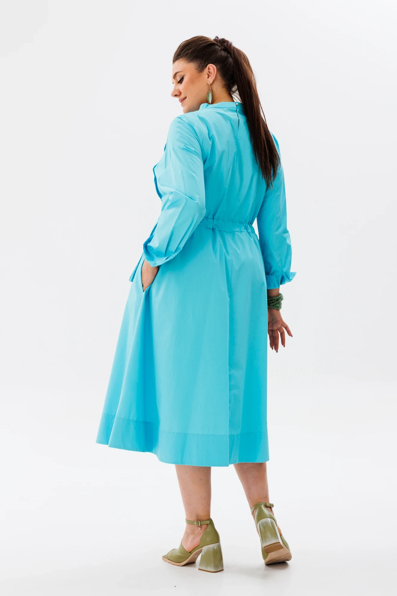 Втачной пояс регулируется по ширине съёмными завязками, что позволяет подчеркнуть талию и создать идеальную посадку. Практичные боковые карманы обеспечивают дополнительное удобство. Воротник-стойка, застёгивающийся на спинке на навесную петлю и пуговицу, придаёт платью стильный и аккуратный вид.