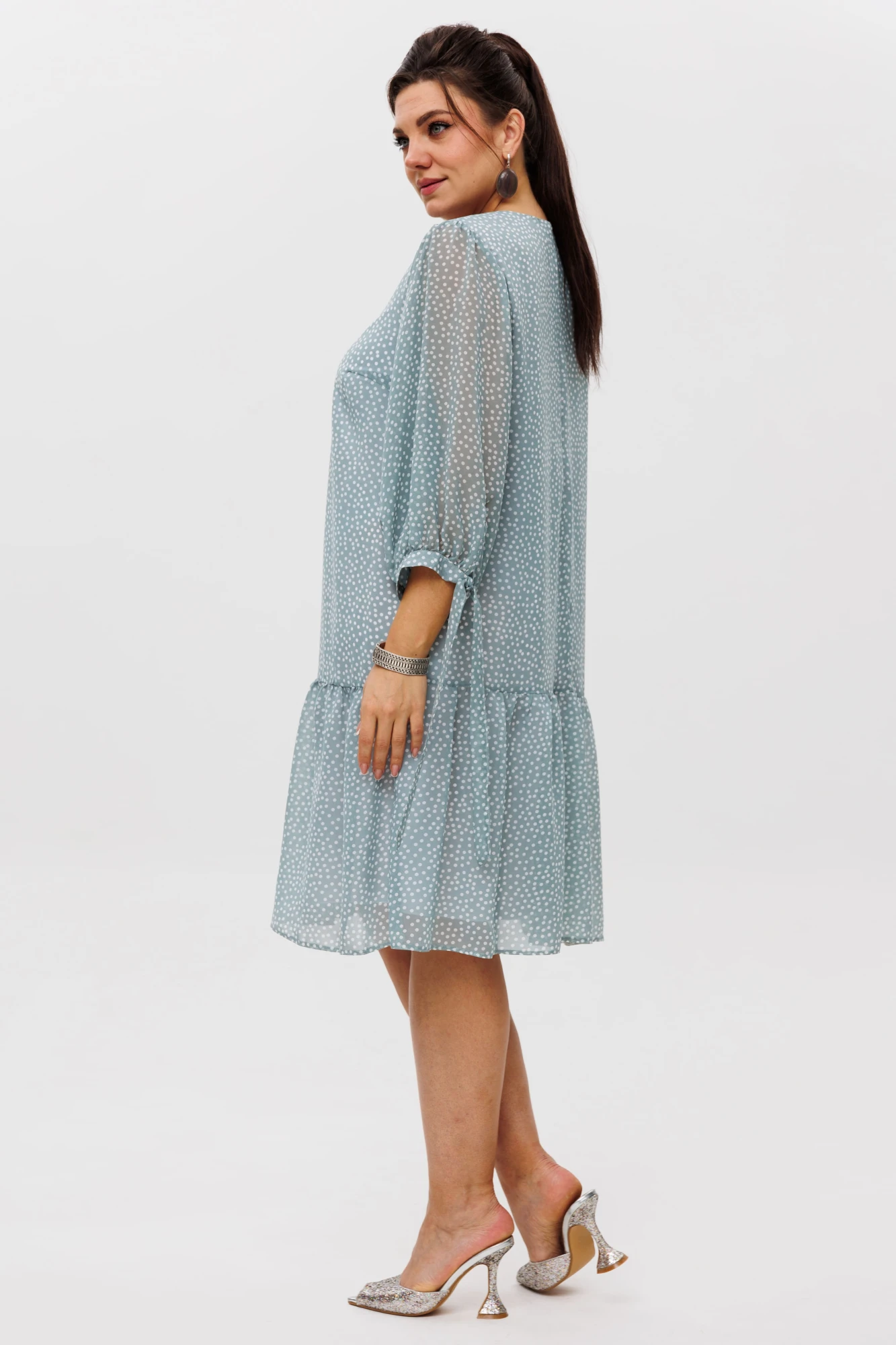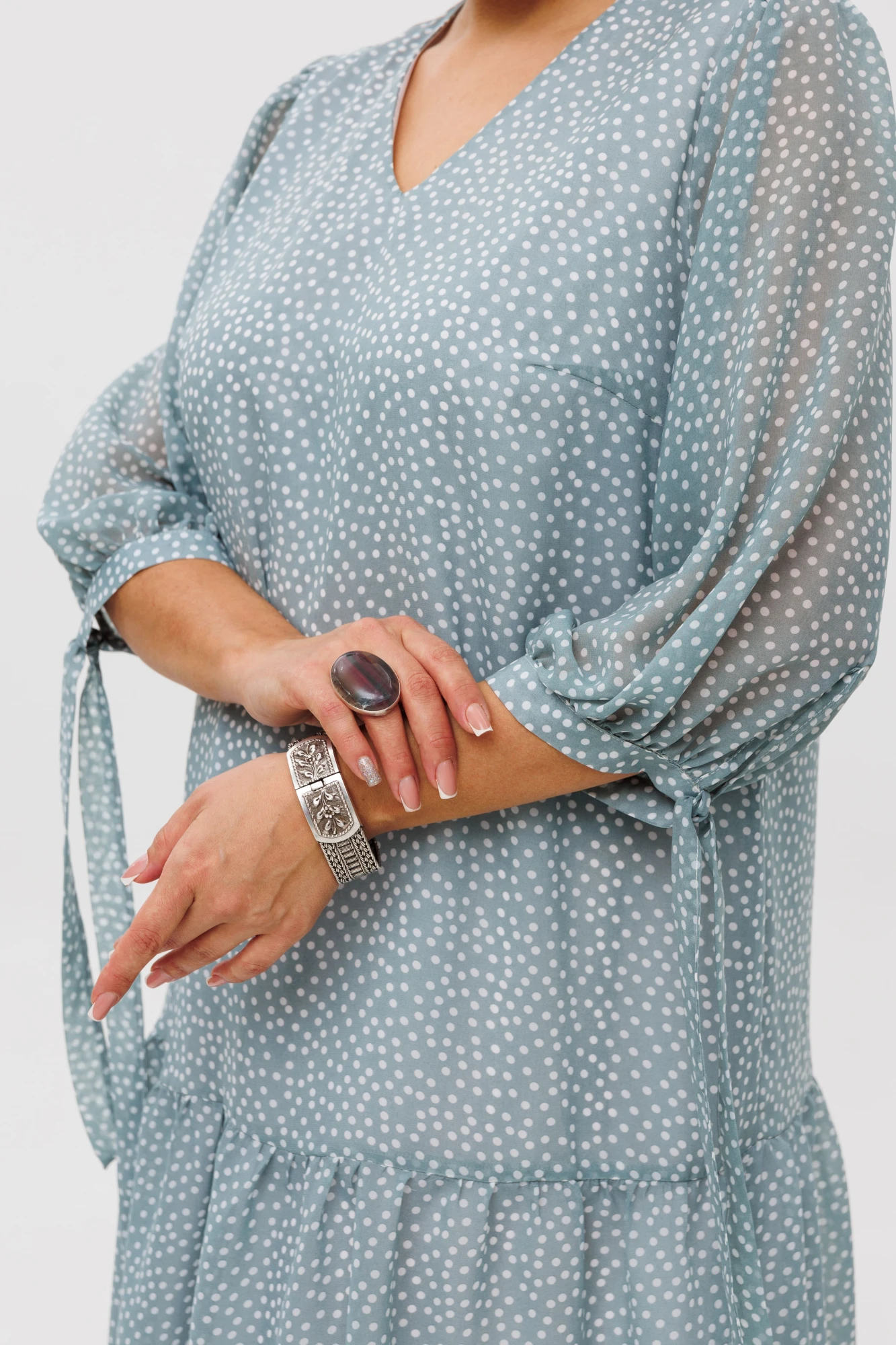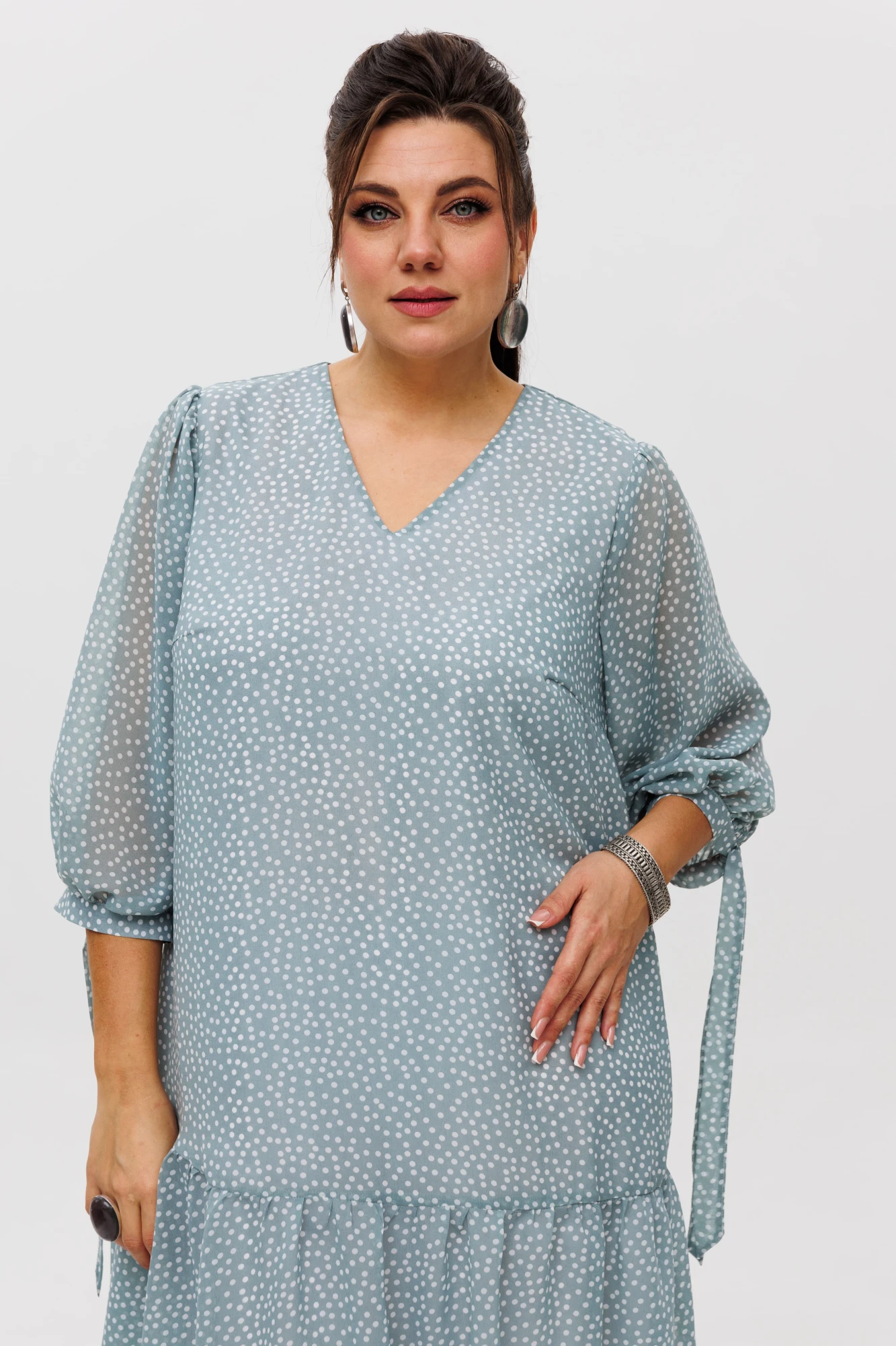 V-образный вырез горловины добавляет элегантности, а волан по низу платья придаёт романтичную нотку образу. Рукава украшены завязками, что делает образ ещё более утончённым.