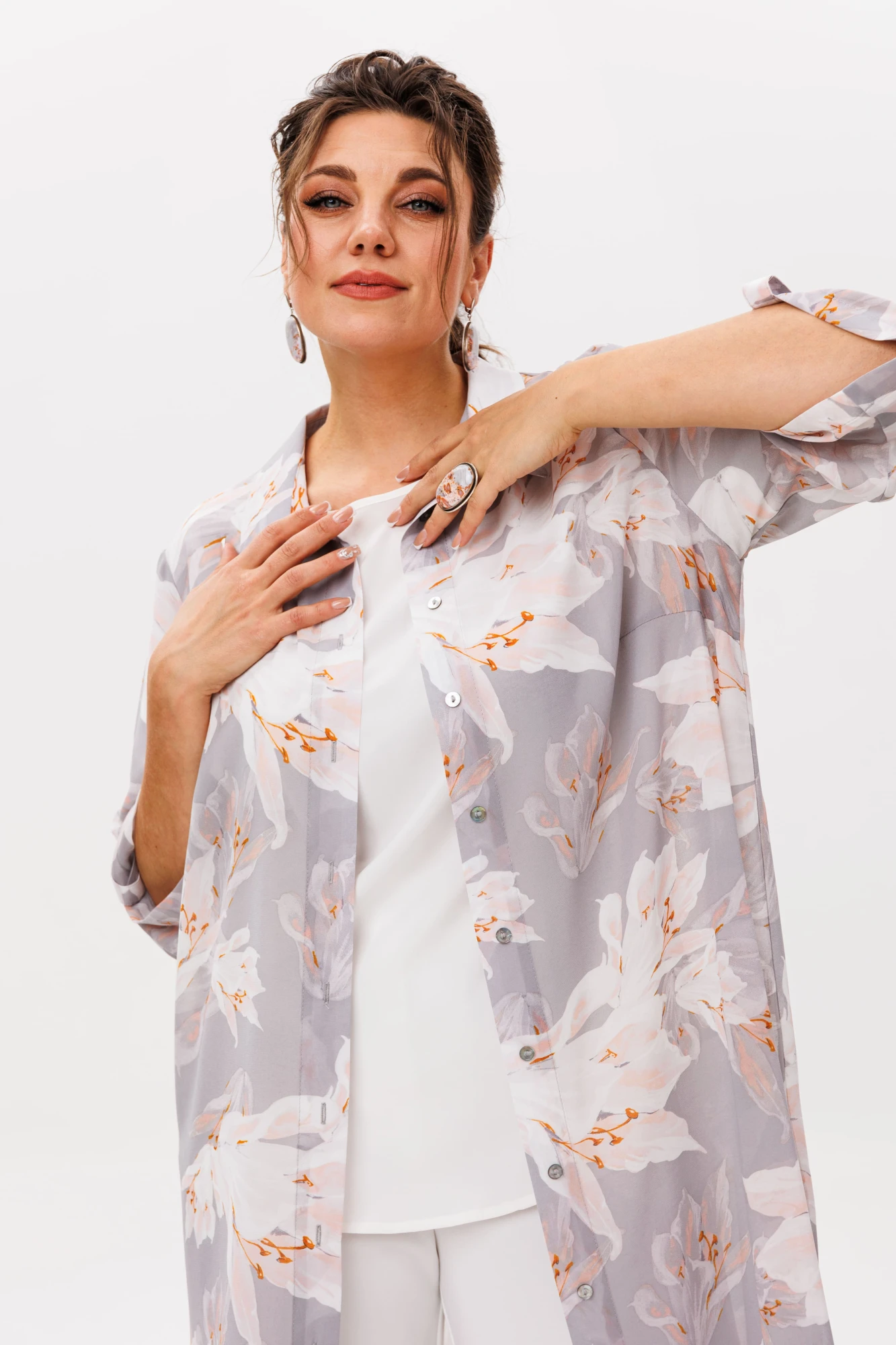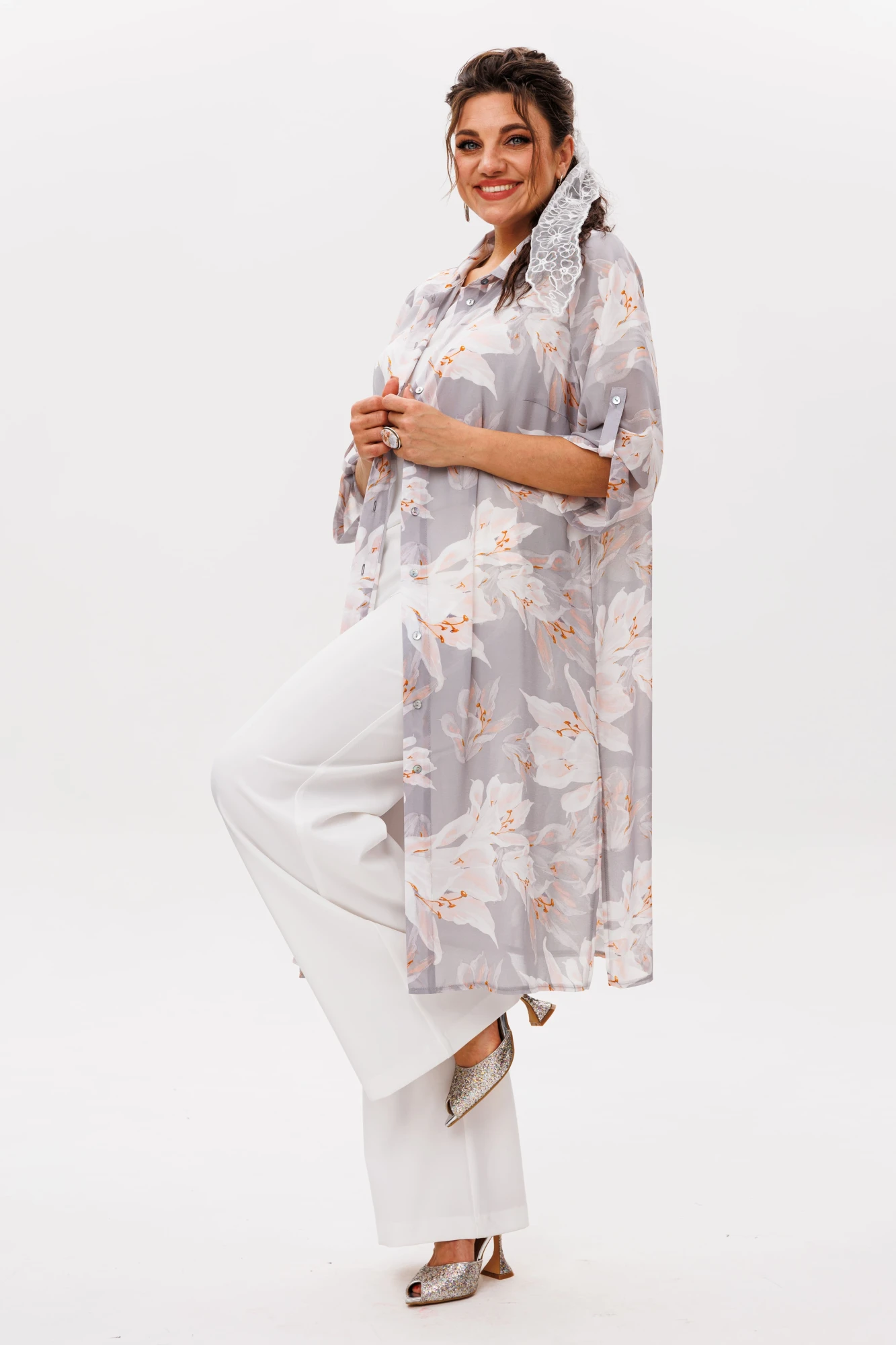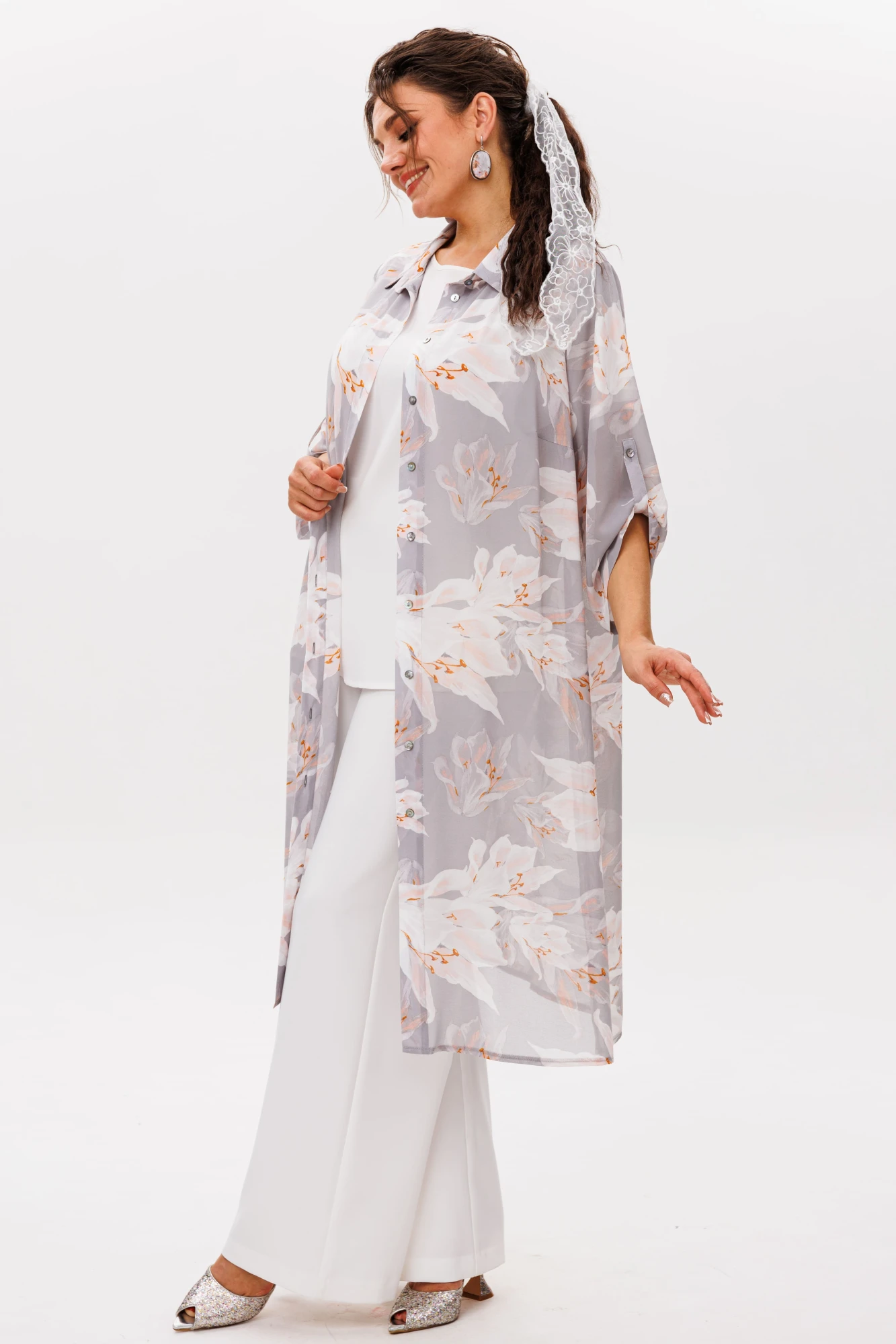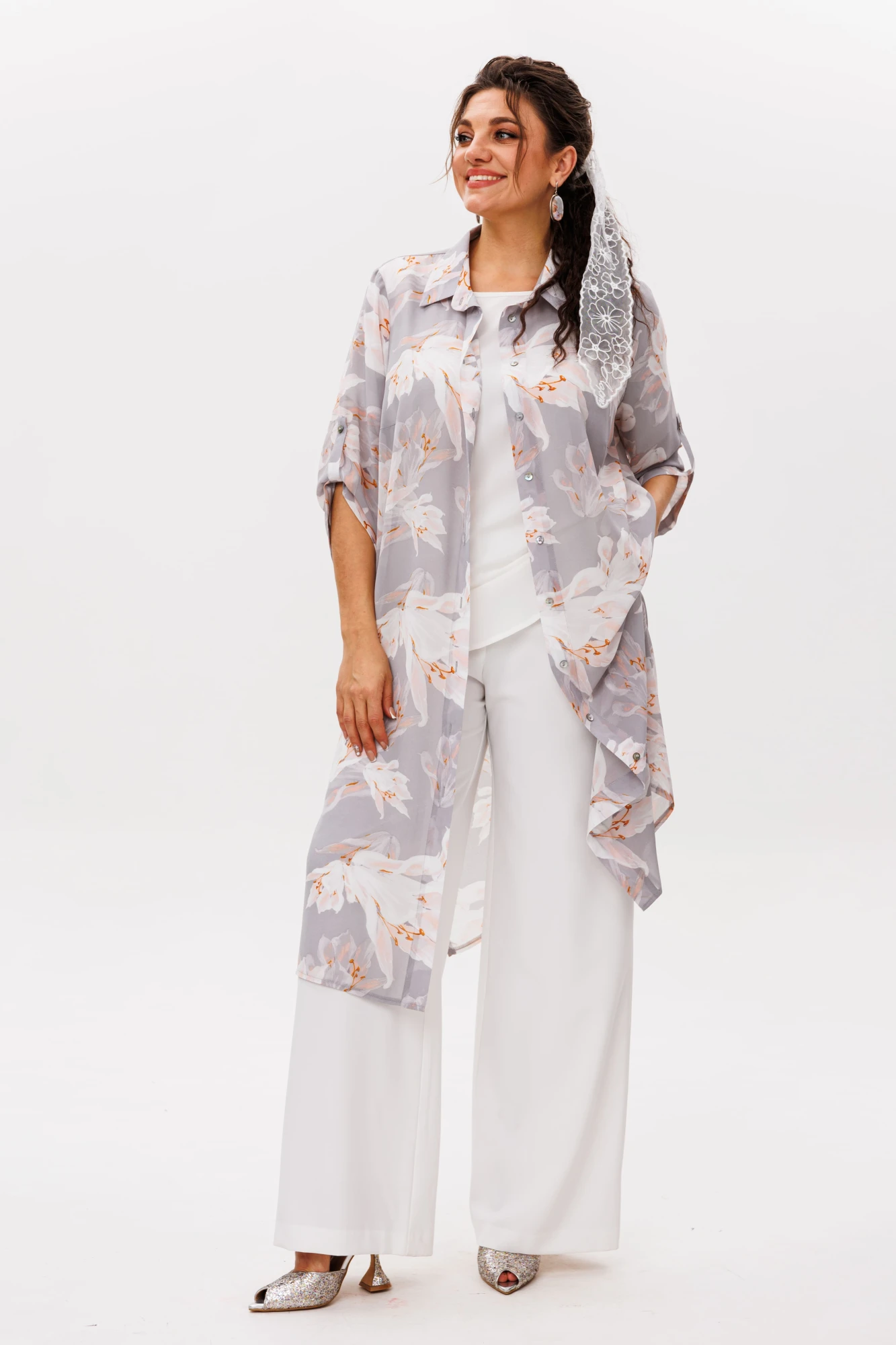 Лёгкий шифон защитит от летнего ветерка, не утяжеляя силуэт, а стильный принт «лилии в тумане» сделает вас заметной в любой ситуации. Это та самая вещь, в которой удобно, красиво и невероятно стильно. Шазюбль – для тех, кто любит моду без границ.