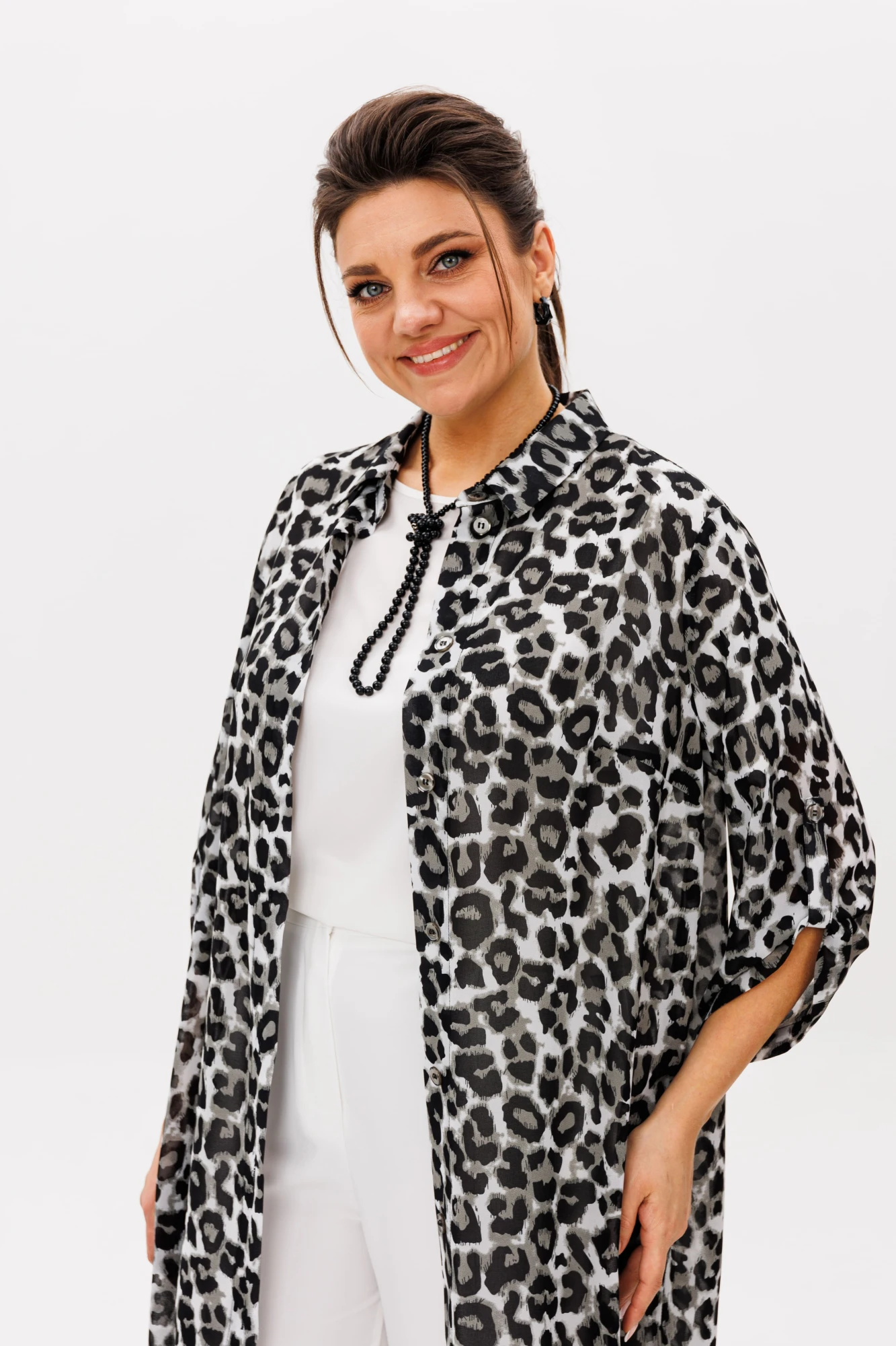 Лёгкий шифон защитит от летнего ветерка, не утяжеляя силуэт, а стильный принт «теневой зверь» сделает вас заметной в любой ситуации. Это та самая вещь, в которой удобно, красиво и невероятно стильно. Шазюбль – для тех, кто любит моду без границ.