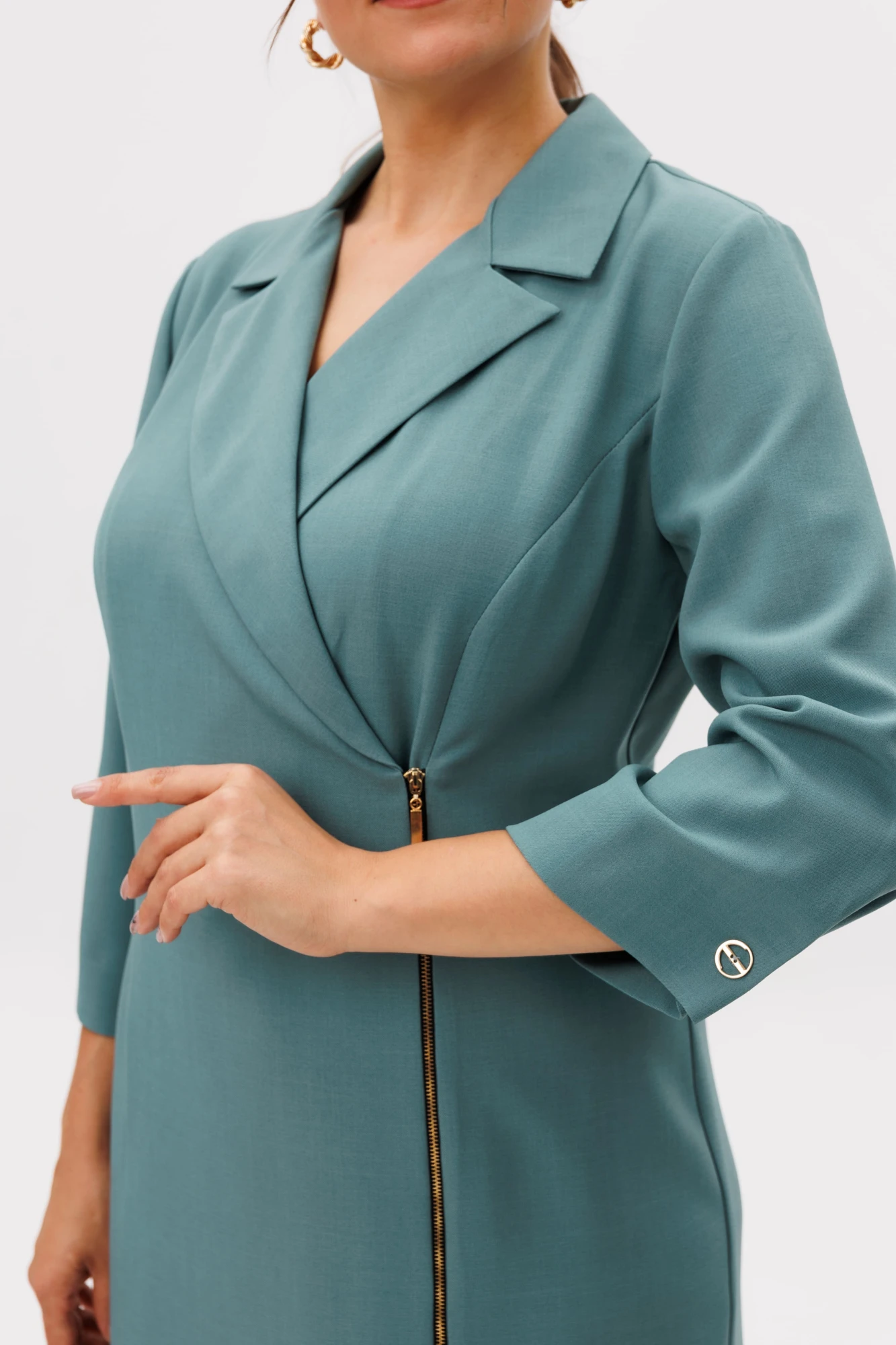 42, 44 , 46 ,48,50, 52Вертикальные рельефы, идущие от проймы по переду и спинке, подчёркивают изящные линии фигуры, придавая платью лаконичную выразительность. Двубортная застёжка с отложными лацканами и воротником добавляет благородную строгость, а асимметричная молния вносит современную деталь, делая образ динамичным. Рукава длиной три четверти со складкой по низу дополняют силуэт лёгкой воздушностью.