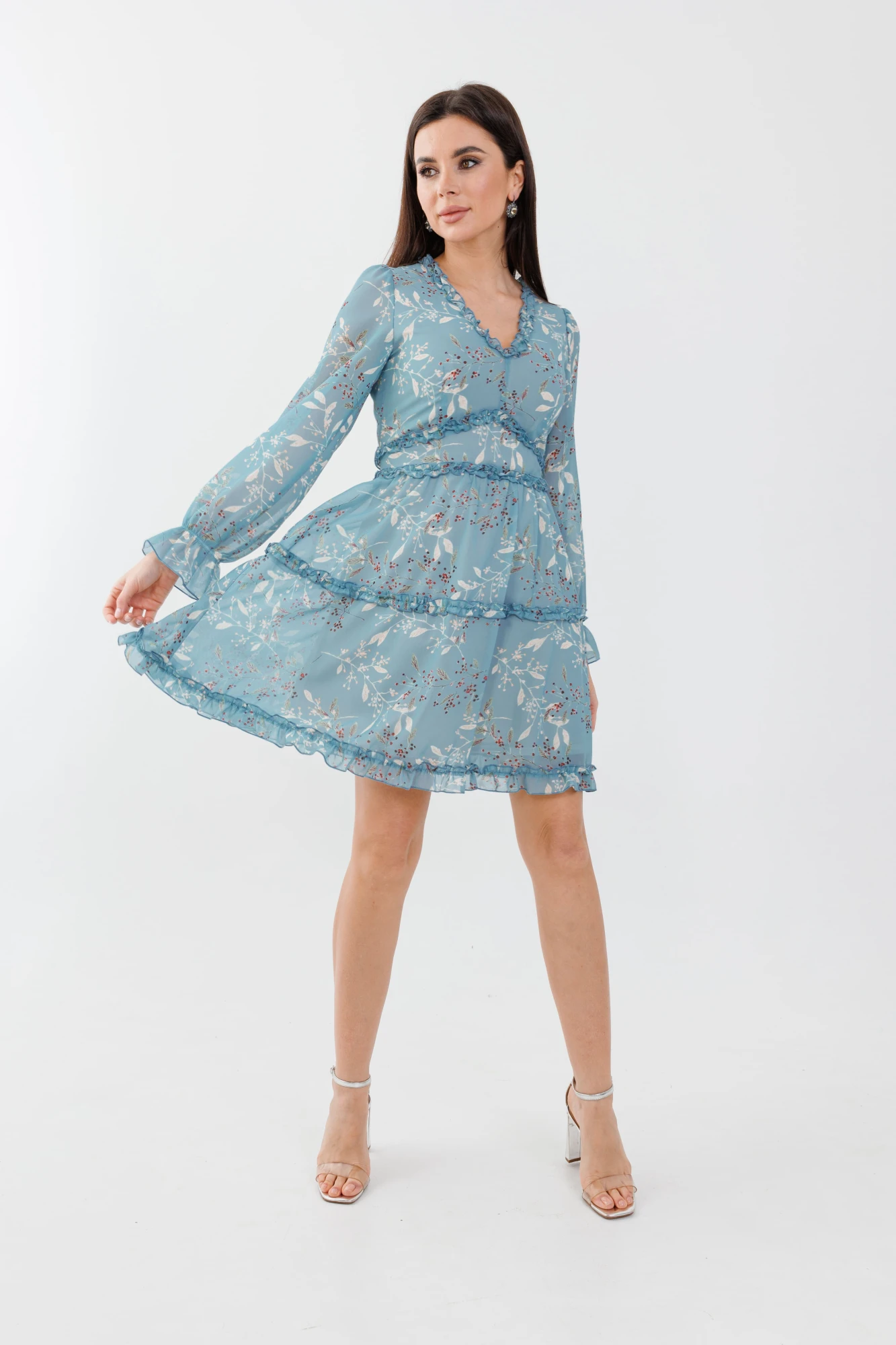 Особенностью модели являются резные вставки под грудью, на талии и линии бедер, украшенные мягкими рюшами. Эти детали добавляют платью объем и движение, создавая интересную игру линий при ходьбе. Длинные втачные рукава с резинкой на запястье обеспечивают удобную посадку и не ограничивают свободу движений.