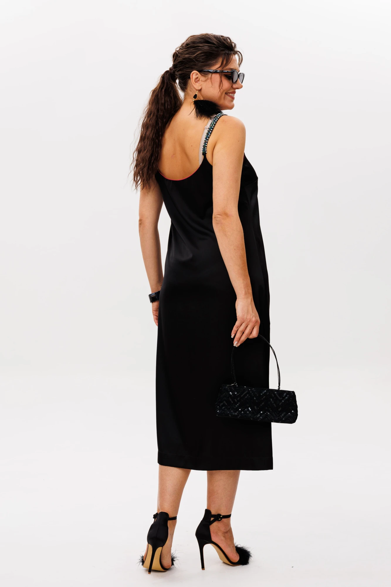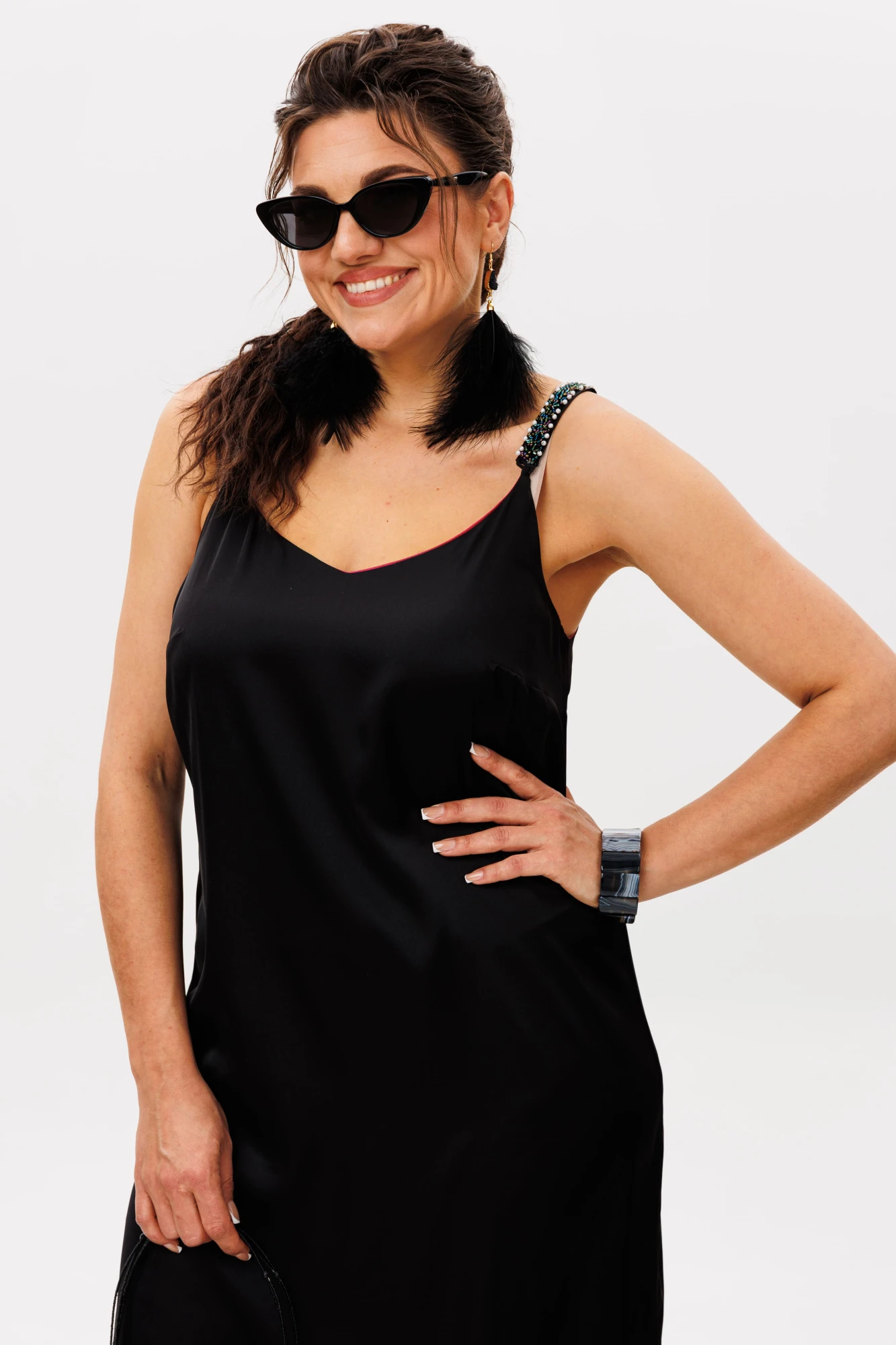 Акцентные съёмные бретели, украшенные россыпью мерцающих бусин, добавляют наряду ноту игривого кокетства, превращая его в настоящее произведение искусства. Каждая бусина ловит свет, создавая игру бликов, которая приковывает восхищённые взгляды. В комплекте – элегантные чёрные бретели на регуляторах, позволяющие идеально подогнать длину и создать безупречный силуэт, подчёркивающий линию плеч.