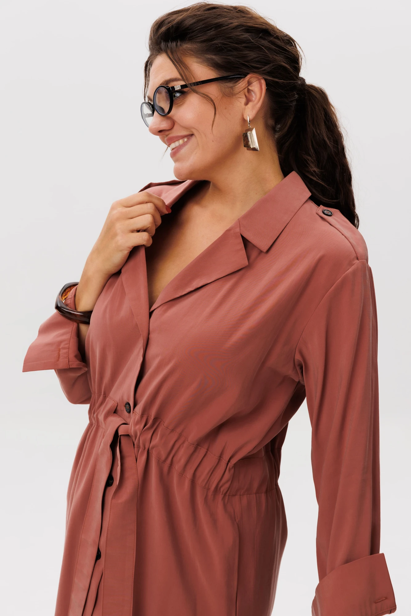Изысканный английский воротник с лацканами придает платью благородную строгость, а центральная застёжка на пуговицы позволяет варьировать степень открытости, адаптируя наряд к разным ситуациям. Кулиска по линии талии и завязывающийся пояс дают возможность регулировать силуэт – от мягкого полуприлегающего до более выразительного, подчёркивающего талию.