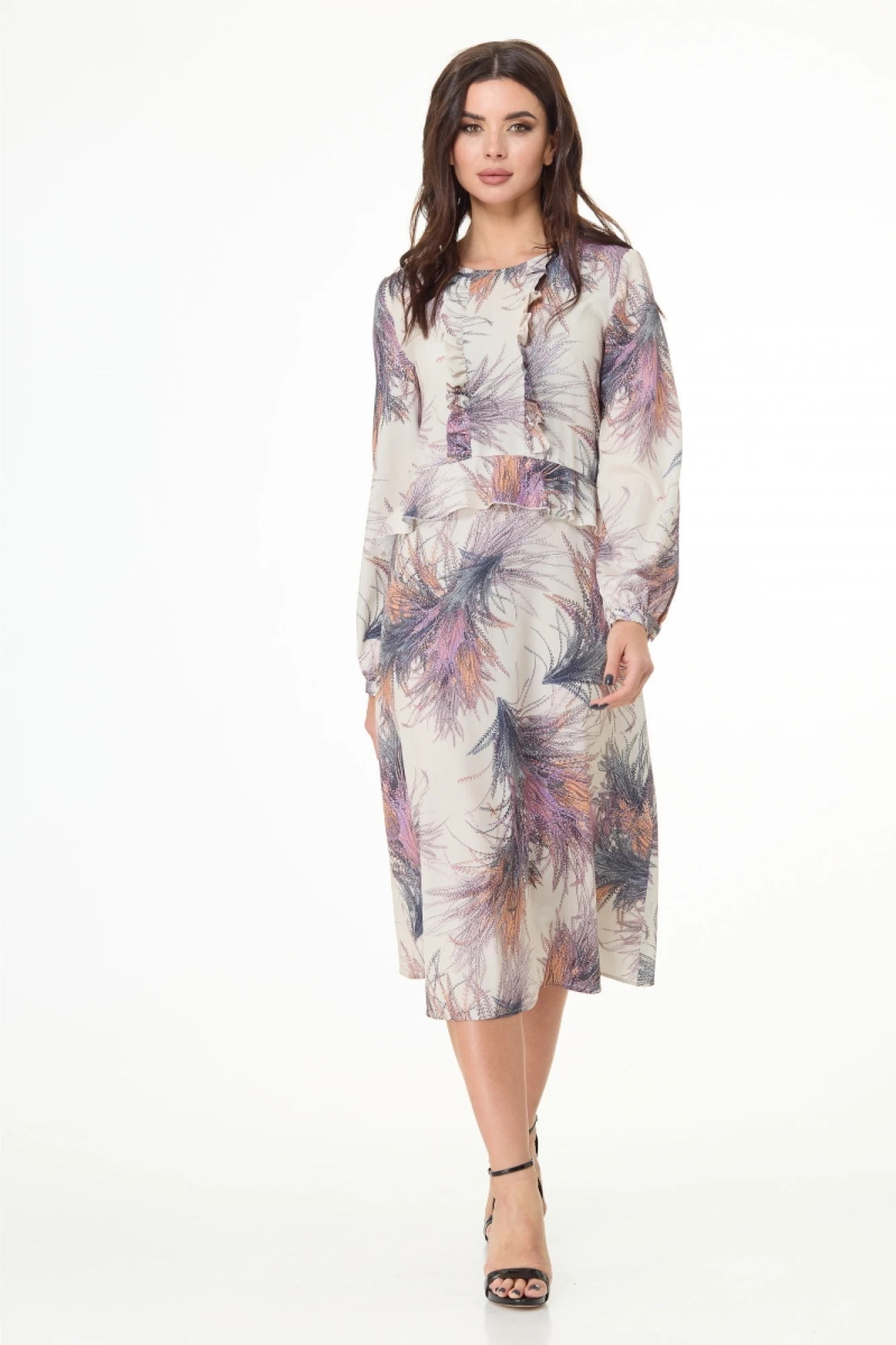Расклешенный подол плавно расширяется книзу, делая каждый шаг грациозным. Длинные рукава с аккуратными манжетами добавляют образу собранности, а округлая горловина мягко обрамляет шею.
