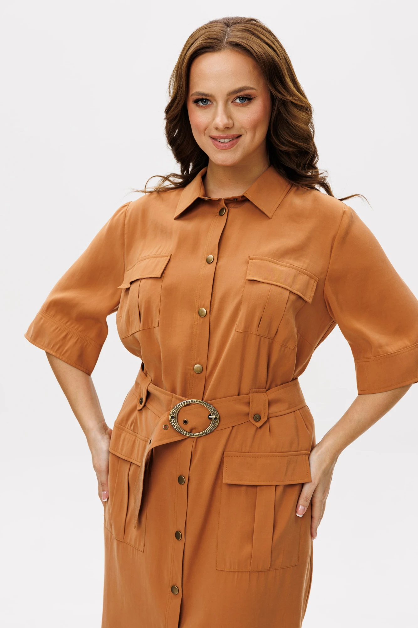 58,60Четкий прямой силуэт платья подчеркивает женственность, сохраняя свободу движений. Втачной короткий рукав с аккуратной манжетой и рубашечный воротник на стойке придают образу собранность и завершенность. Практичность здесь сочетается с эстетикой – застежка на кнопках по всей длине позволяет легко регулировать степень открытости, а настрочные карманы с клапанами добавляют характерный штрих сафари-эстетик