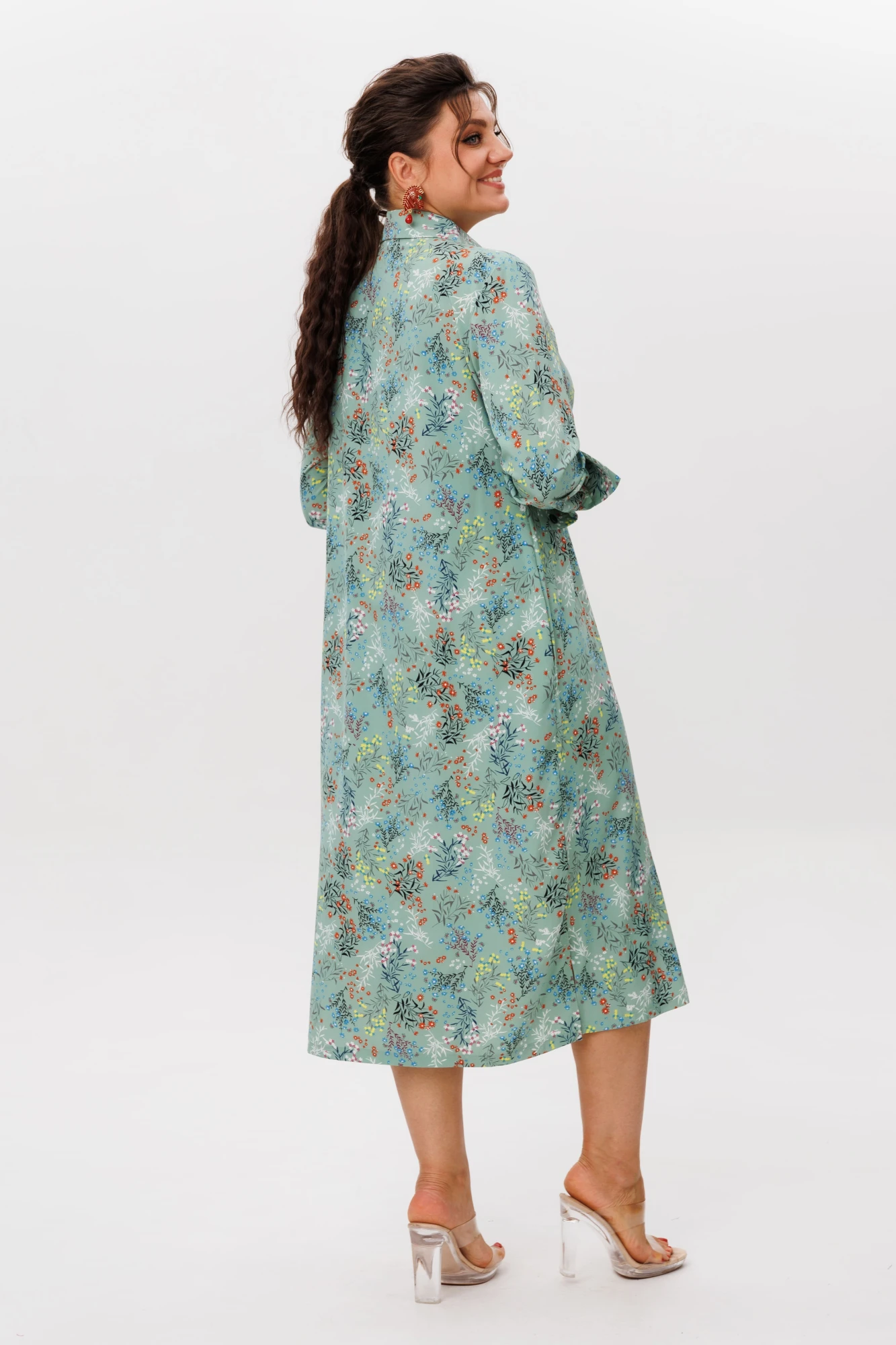Длинный втачной рукав с аккуратными манжетами придает платью строгость и завершенность, а классический рубашечный воротник добавляет нотку сдержанного шика. Застежка на пуговицы по всей длине переда не только делает платье удобным, но и позволяет варьировать степень открытости, создавая разные образы — от строгого офисного до романтично-раскованного.